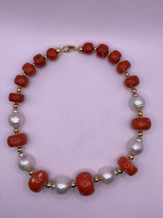 A necklace with coral beads on a 14kt chain