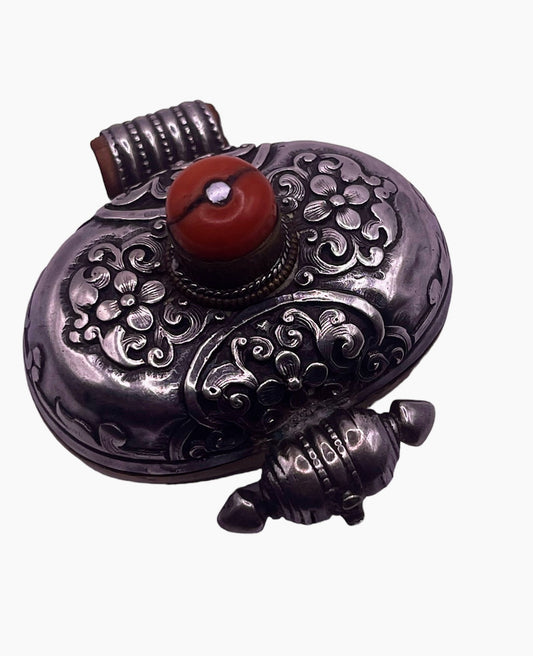 An antique silver and coral ghau amulet
