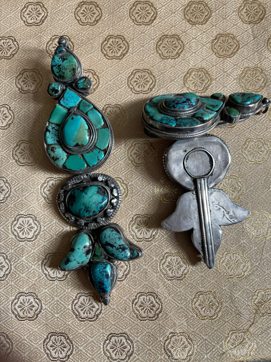 Pair of antique turquoise and silver Tibetan ear pendant / earring