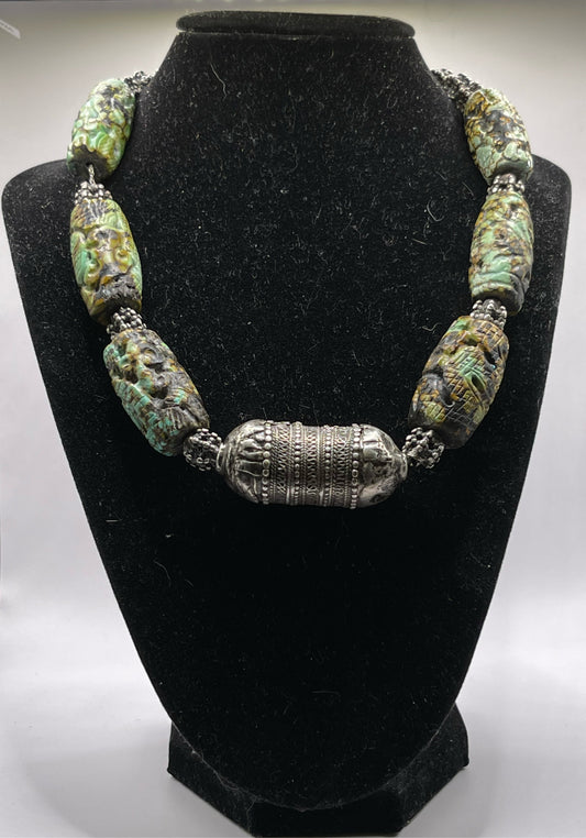 Vintage necklace with carved turquoise beads and antique silver beads