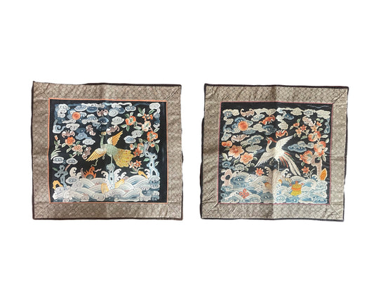 A pair of framed embroidered antique silk wall hangings