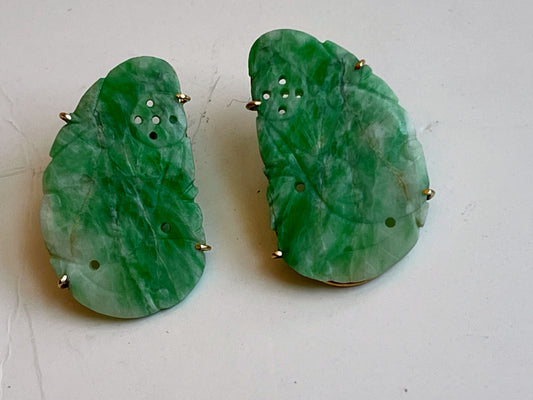 A pair of carved jade earrings in a gilded silver setting