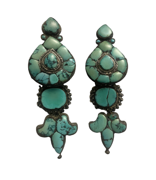 Pair of antique turquoise and silver Tibetan earrings -Ah long