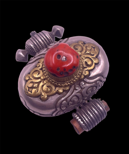 An antique silver and coral ghau amulet