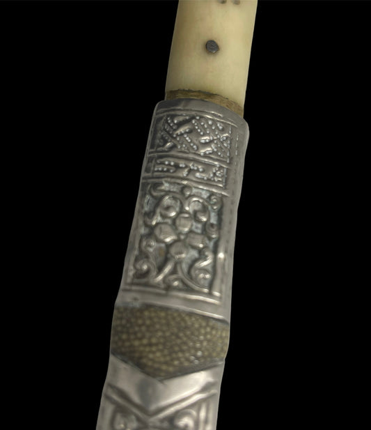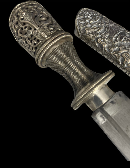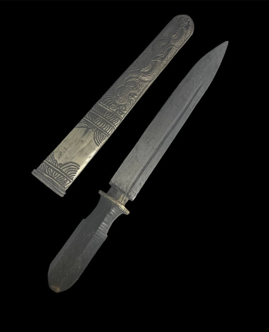 An antique Bhutanese dozum - dagger with a carved silver sheath