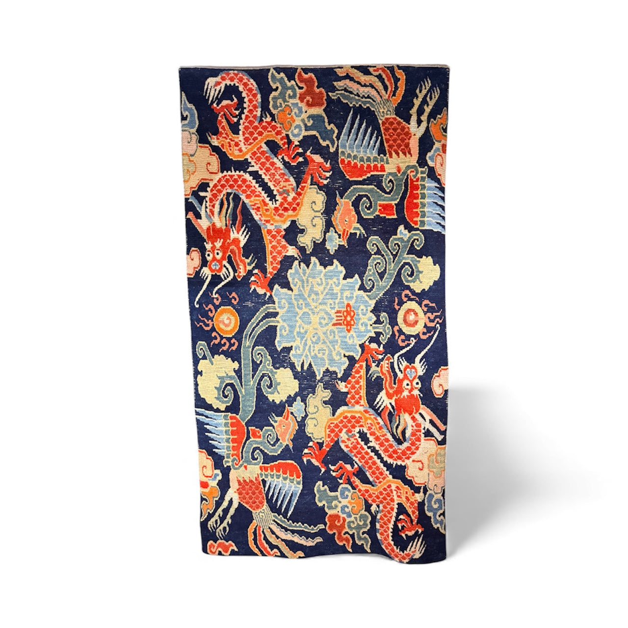 Dragons and Phoenixes, unlike the west, are seen as benign, benevolent creatures in Tibetan cultures; and considered symbols of a long peaceful and bountiful life. When paired together as in this rug they represent harmony - the masculine and feminine energies. This mid 20th C., Tibetan , all wool rug has two sets of dragons and phoenixes, and measures 33"x63-1/2" and has a black background.
