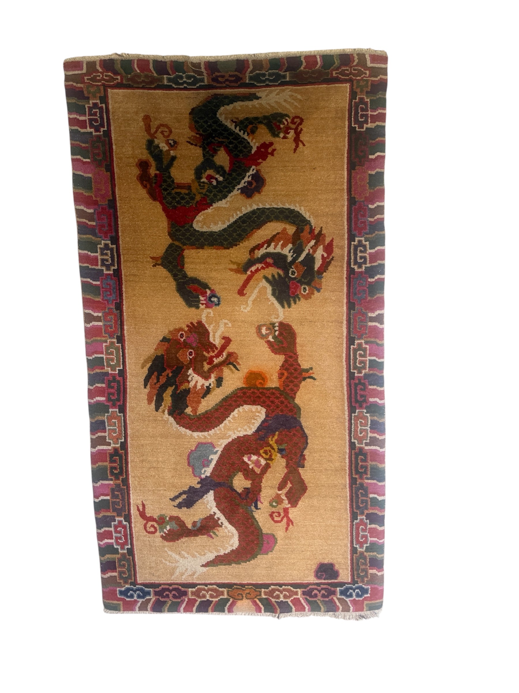 A vintage mid- 20th C., Tibetan rug - rug with a border design and pair of dragons on a beige base colored carpet. The rug measures 3' wide X 5'-7" length.