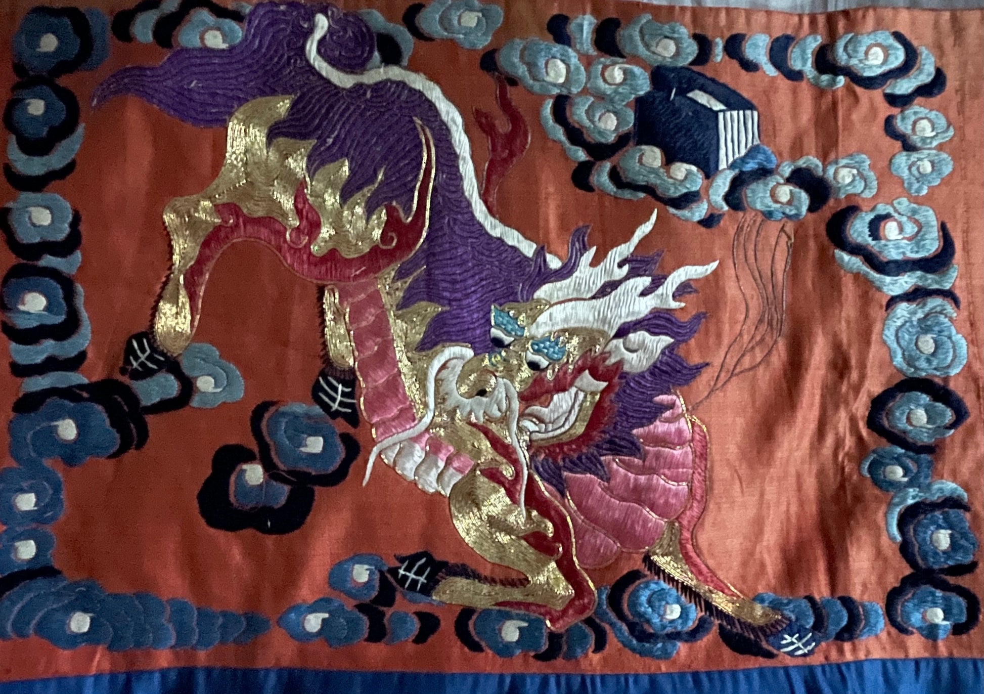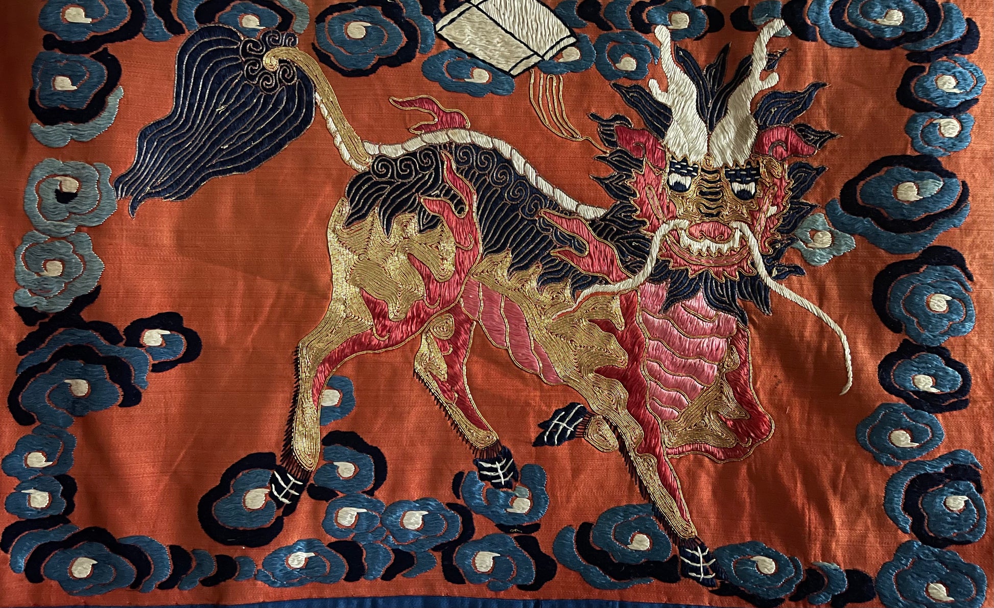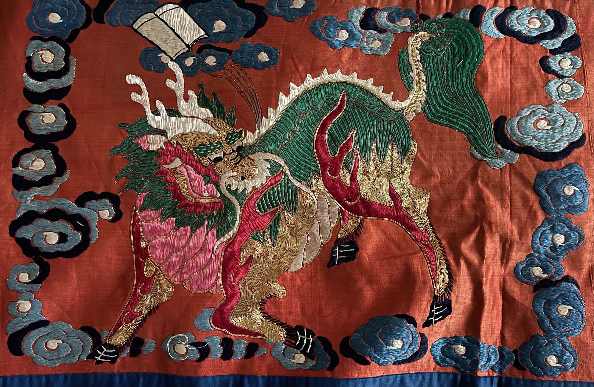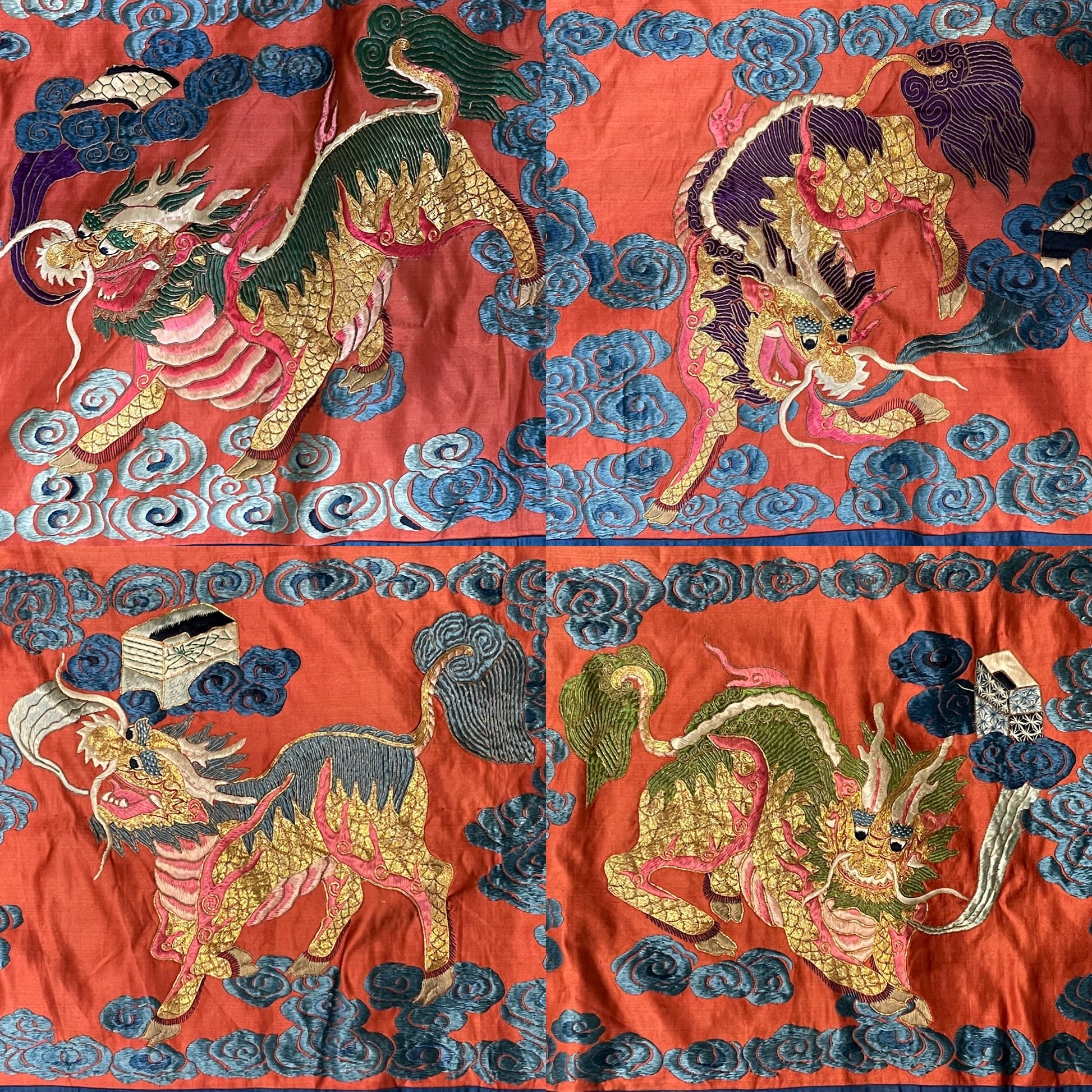 An antique Chinese Wall Hanging with Mythical Creatures- Qilin, dragons and foo dogs. The wall hanging measures 154'' x 43'' (391 x 109 cm) and consists of two horizontal panel stitched together with a band of blue silk. Each horizontal band - peach silk in color has four creatures embroidered on it measuring approximately 18"X 18" and spaced evenly and staggered so that the creatures are not above each other.