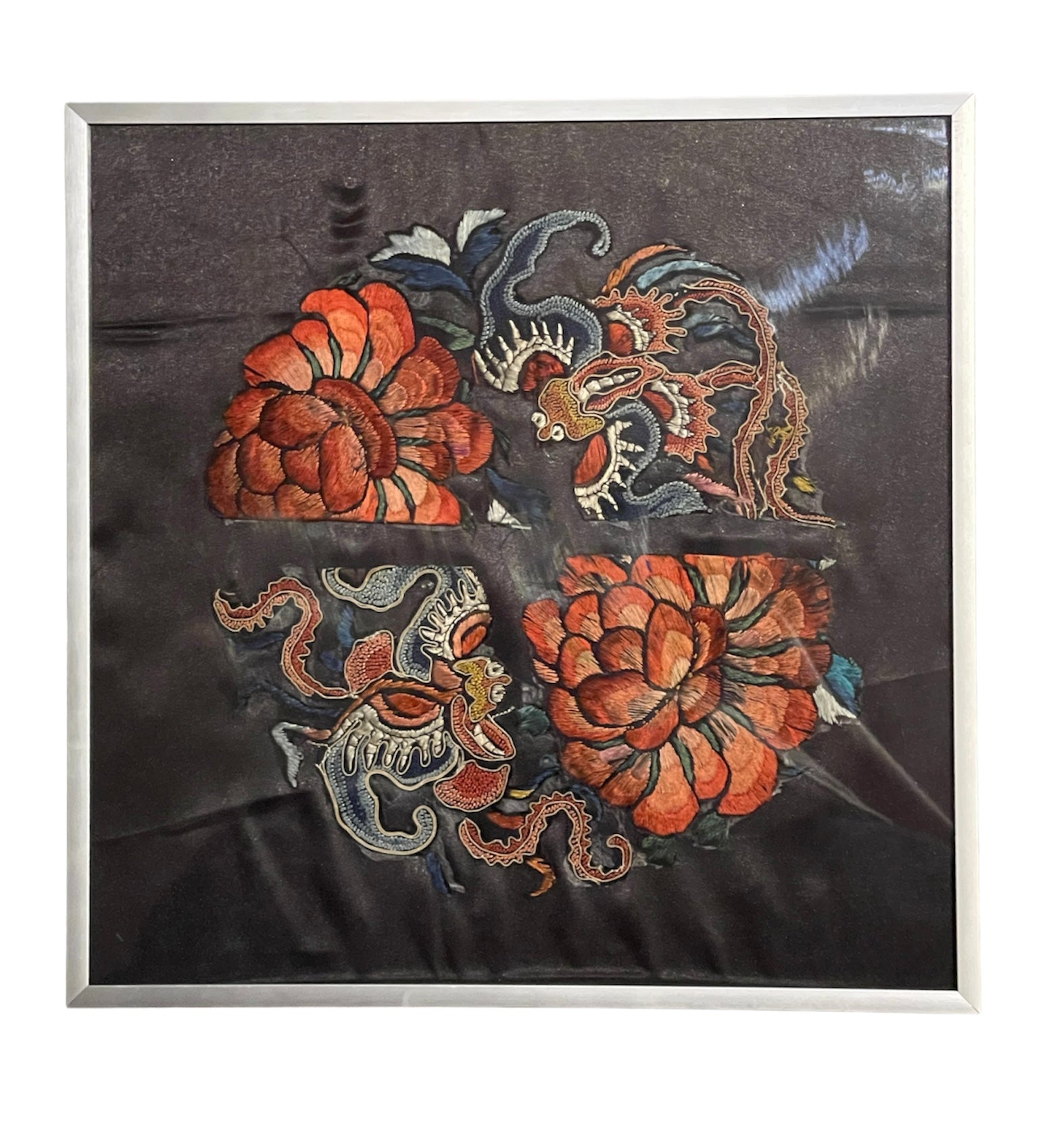 An antique Framed Chinese embroidered fabric fragment in a 12”x12” frame.