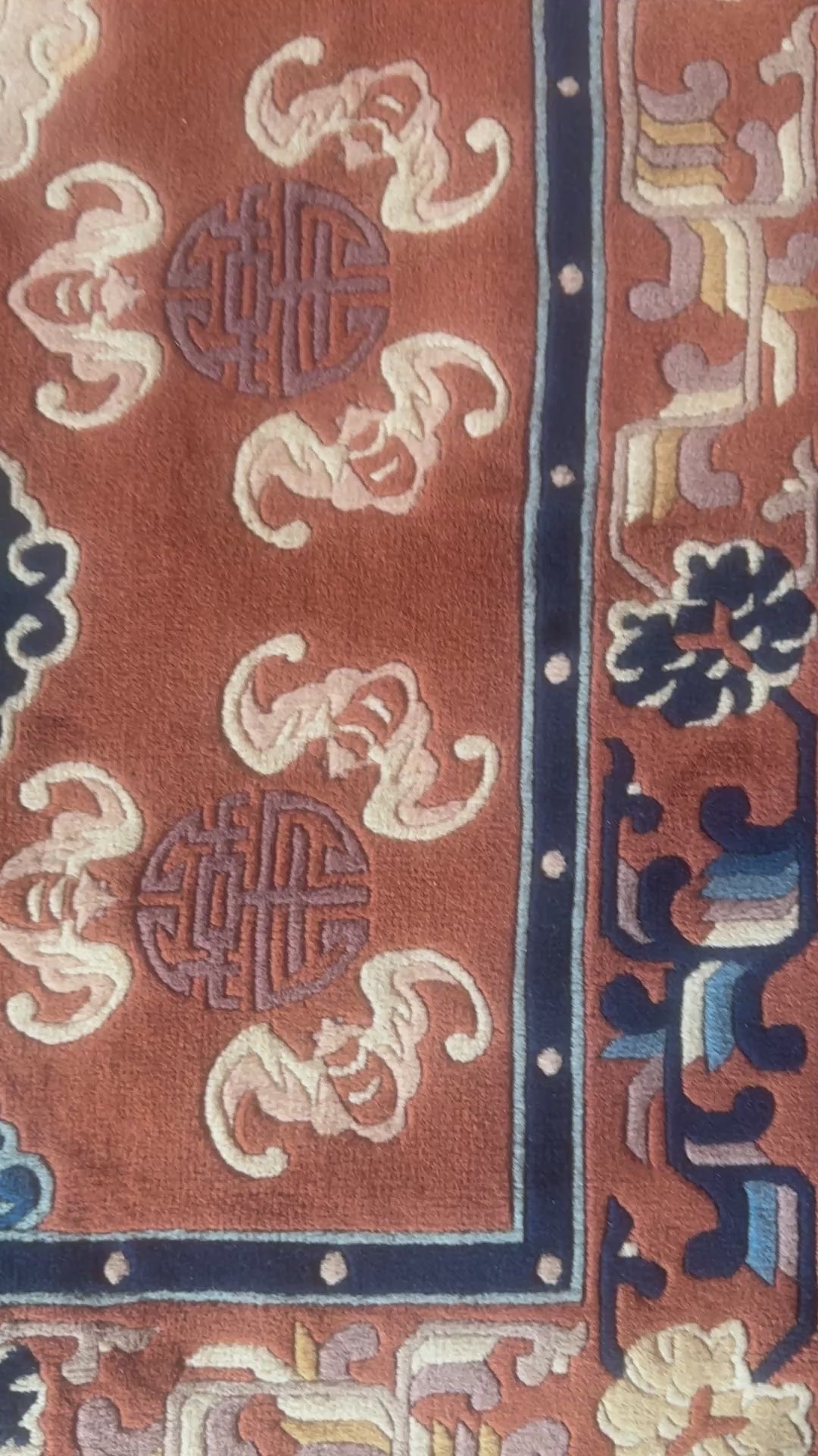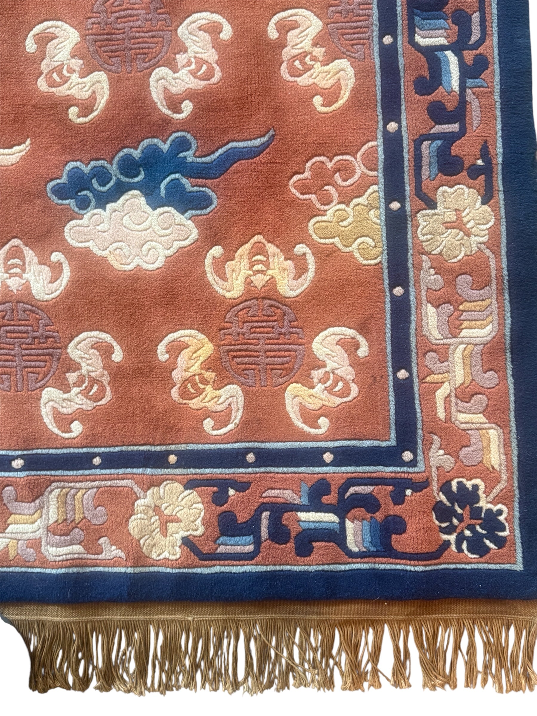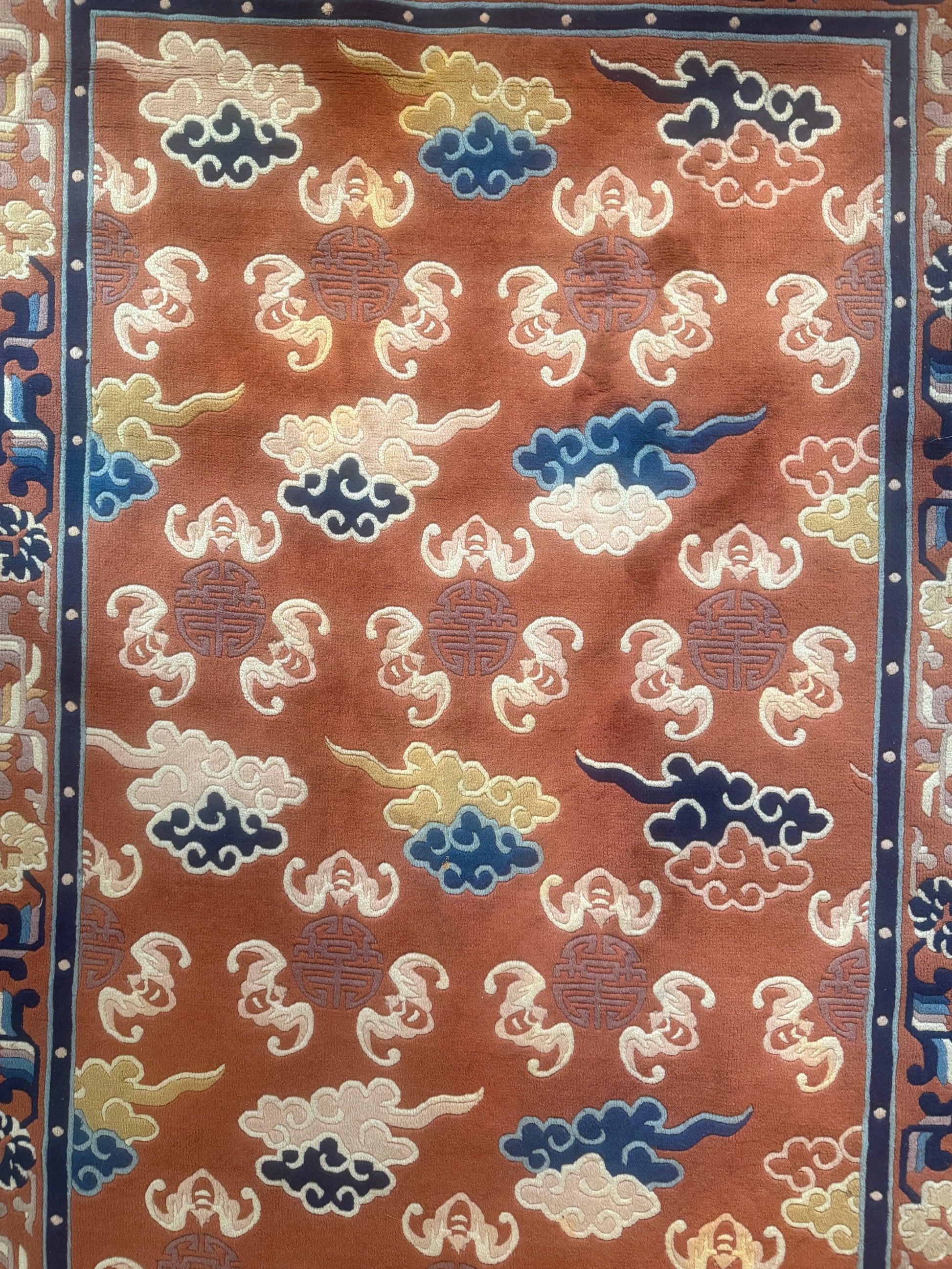 Ningxia , a wool town’ in north-central China, bordering Gansu and Inner Mongolia, has produced carpets since early 17th century for local sale and for use in mandarin and aristocratic houses in China proper. Almost all of the larger antique pieces exported in the late 19th-early 20th century were from Ningxia. Ningxia rugs were woven in virtually any format: large square audience (‘throne’) carpets; long and narrow kang carpets; pillar rugs; saddle rugs; chair seats and backs; and monastery meditation hall runners. Ningxia was the source for many of the pillar carpets, runners and large audience carpets for Tibetan and other Buddhist monasteries. Occasionally these rugs are inscribed in Tibetan character to give the patrons of the work and its intended location.