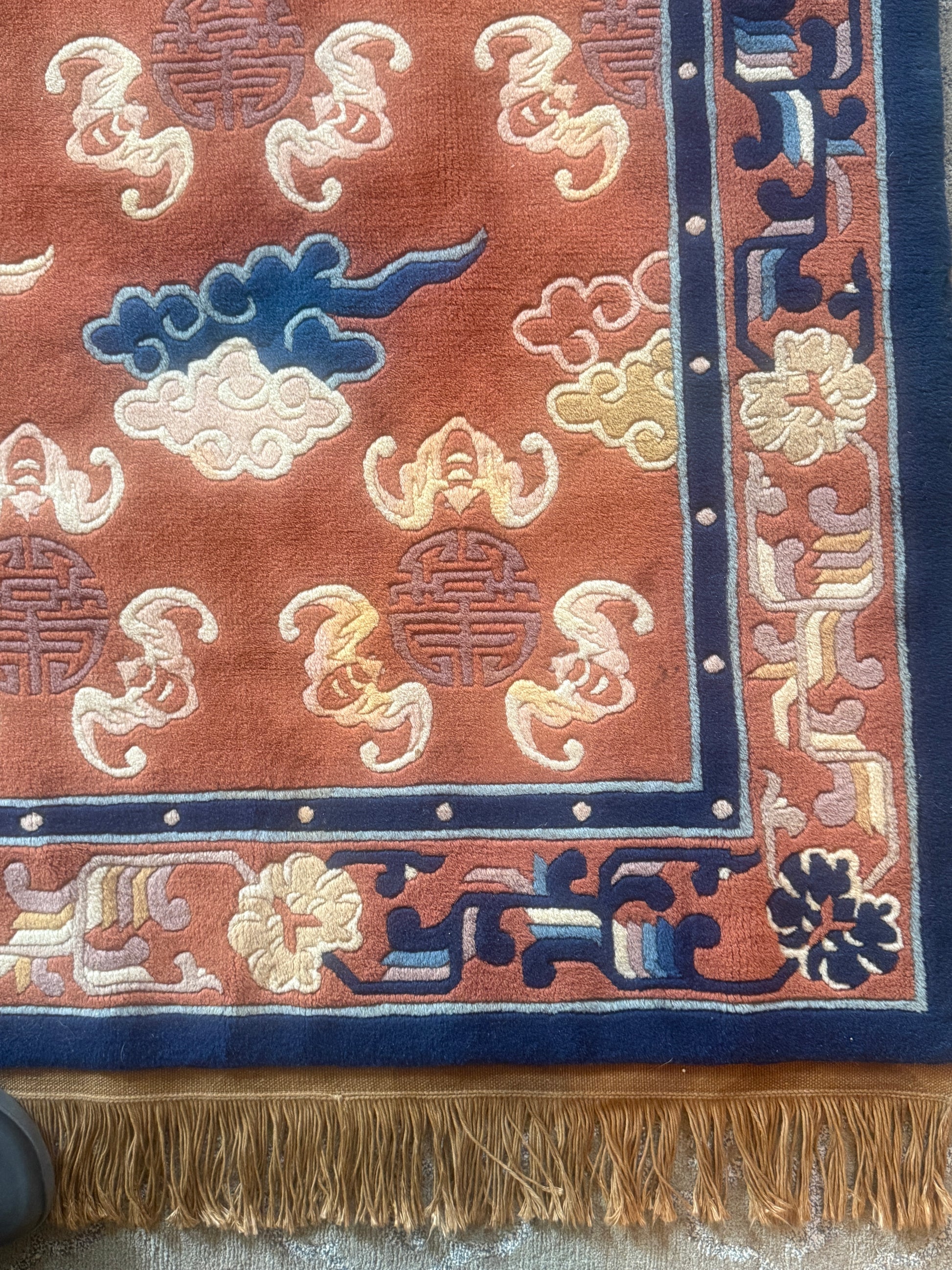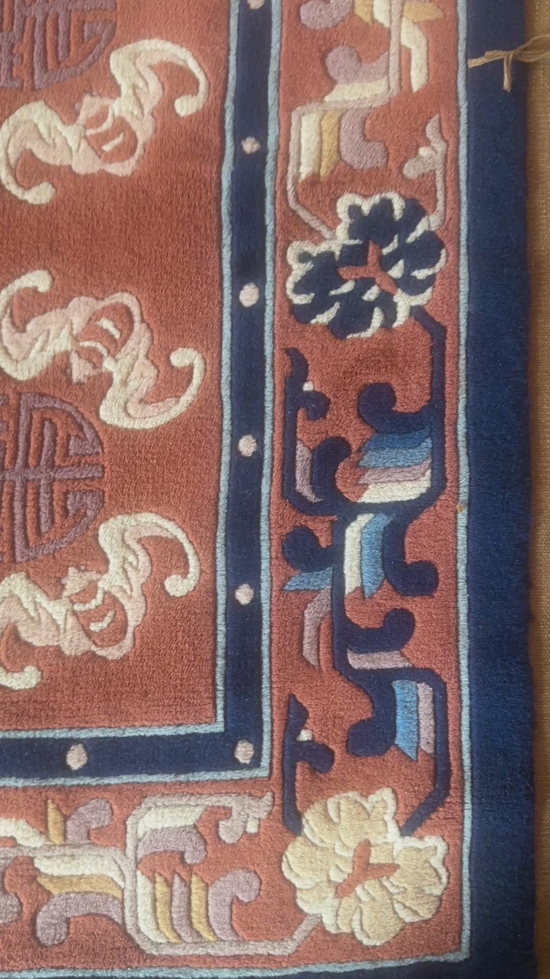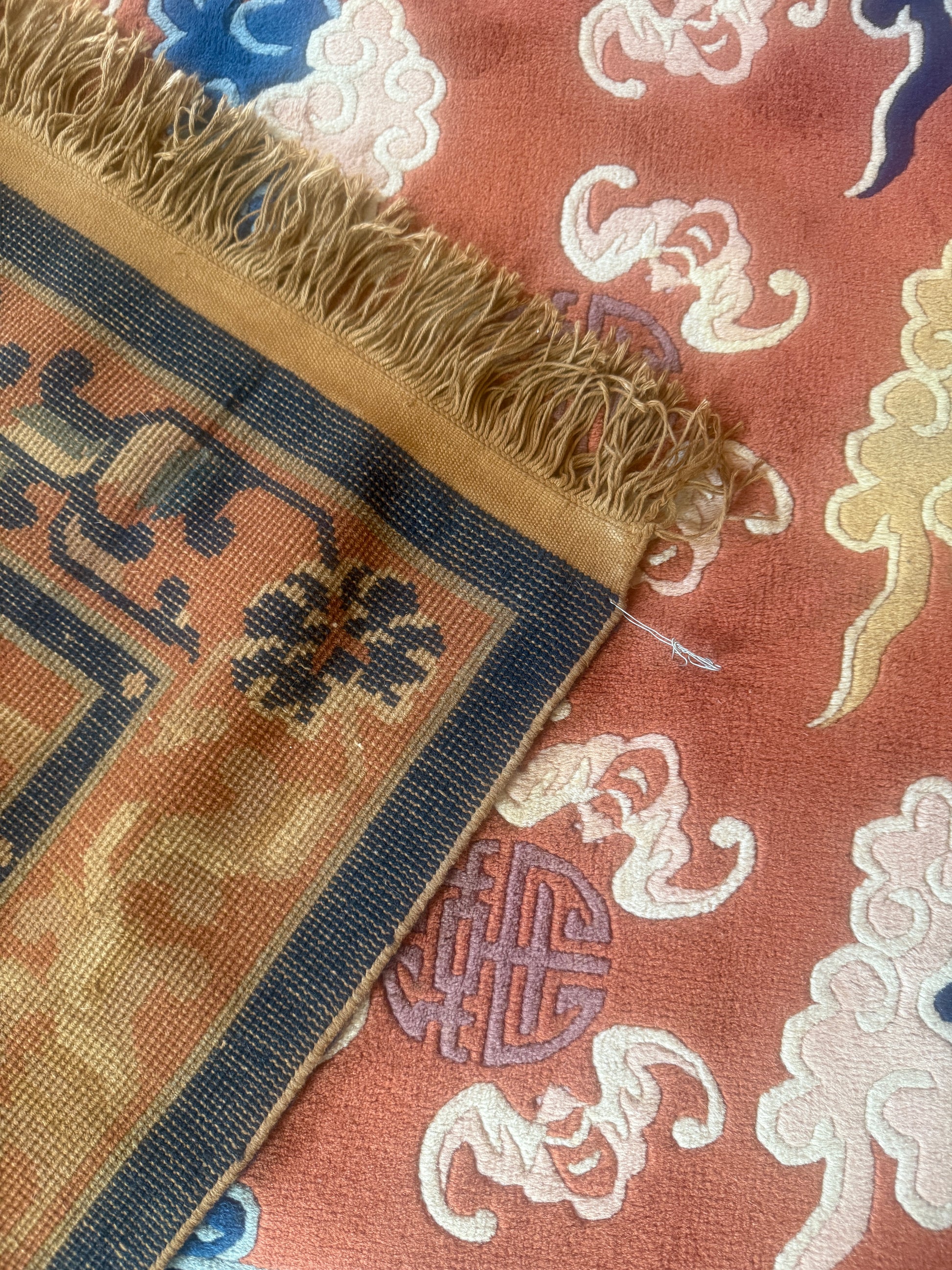 Ningxia , a wool town’ in north-central China, bordering Gansu and Inner Mongolia, has produced carpets since early 17th century for local sale and for use in mandarin and aristocratic houses in China proper. Almost all of the larger antique pieces exported in the late 19th-early 20th century were from Ningxia. Ningxia rugs were woven in virtually any format: large square audience (‘throne’) carpets; long and narrow kang carpets; pillar rugs; saddle rugs; chair seats and backs; and monastery meditation hall runners. Ningxia was the source for many of the pillar carpets, runners and large audience carpets for Tibetan and other Buddhist monasteries. Occasionally these rugs are inscribed in Tibetan character to give the patrons of the work and its intended location.