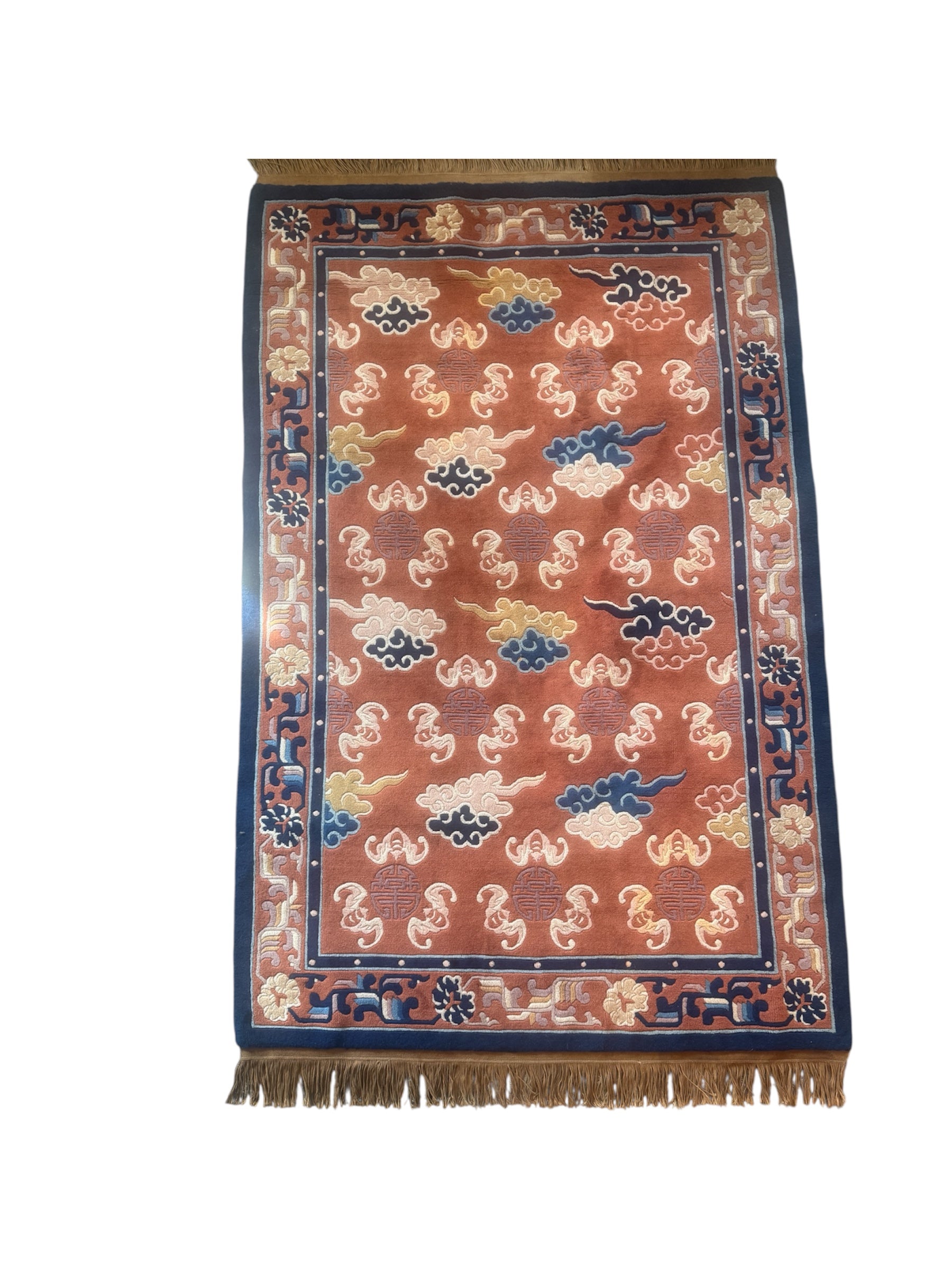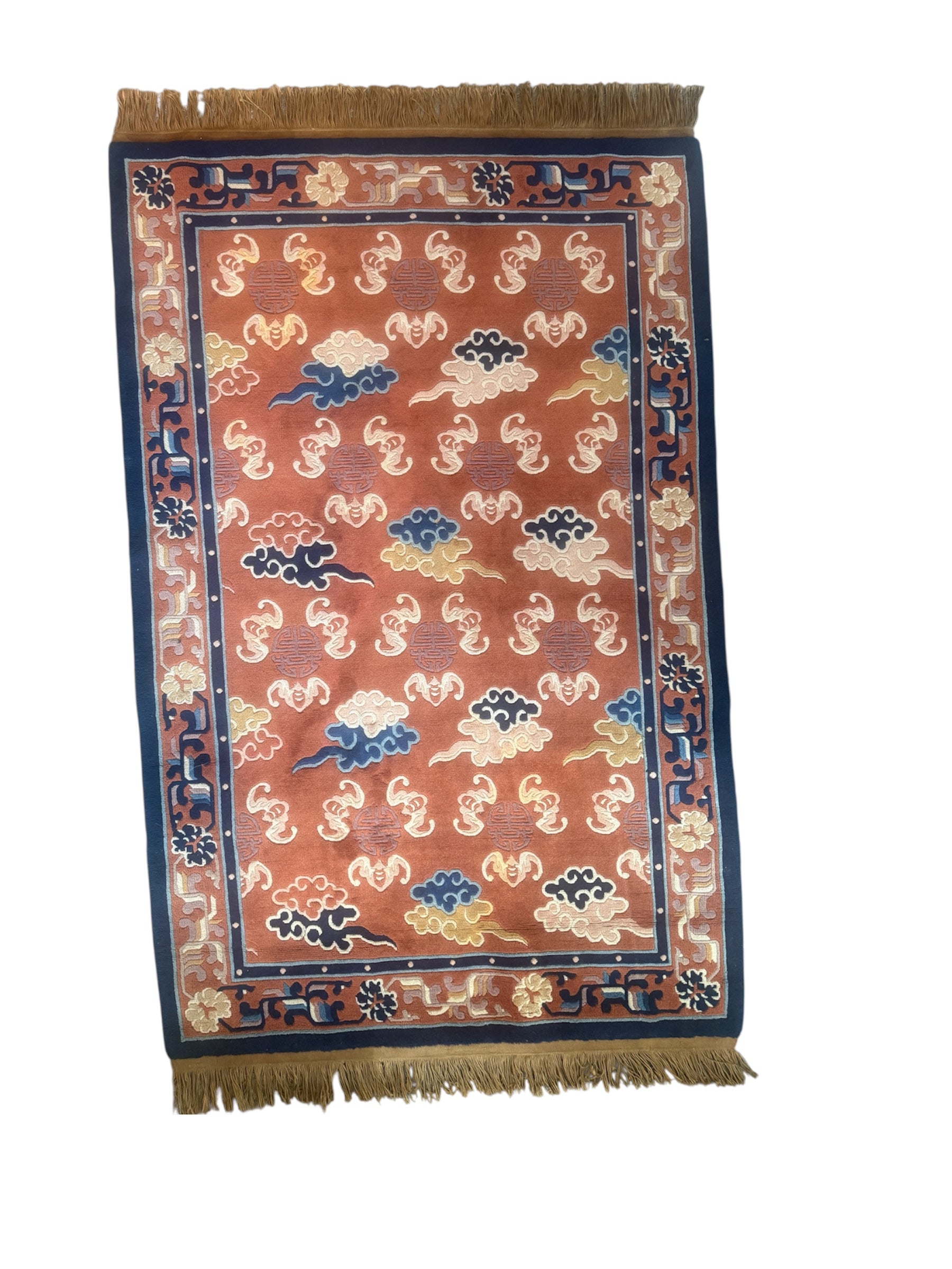 This Mid-20th Century carpet is 75”x 48”. It consists of clouds in an ochre background along with a simple floral border. The carpet is in an overall good condition.