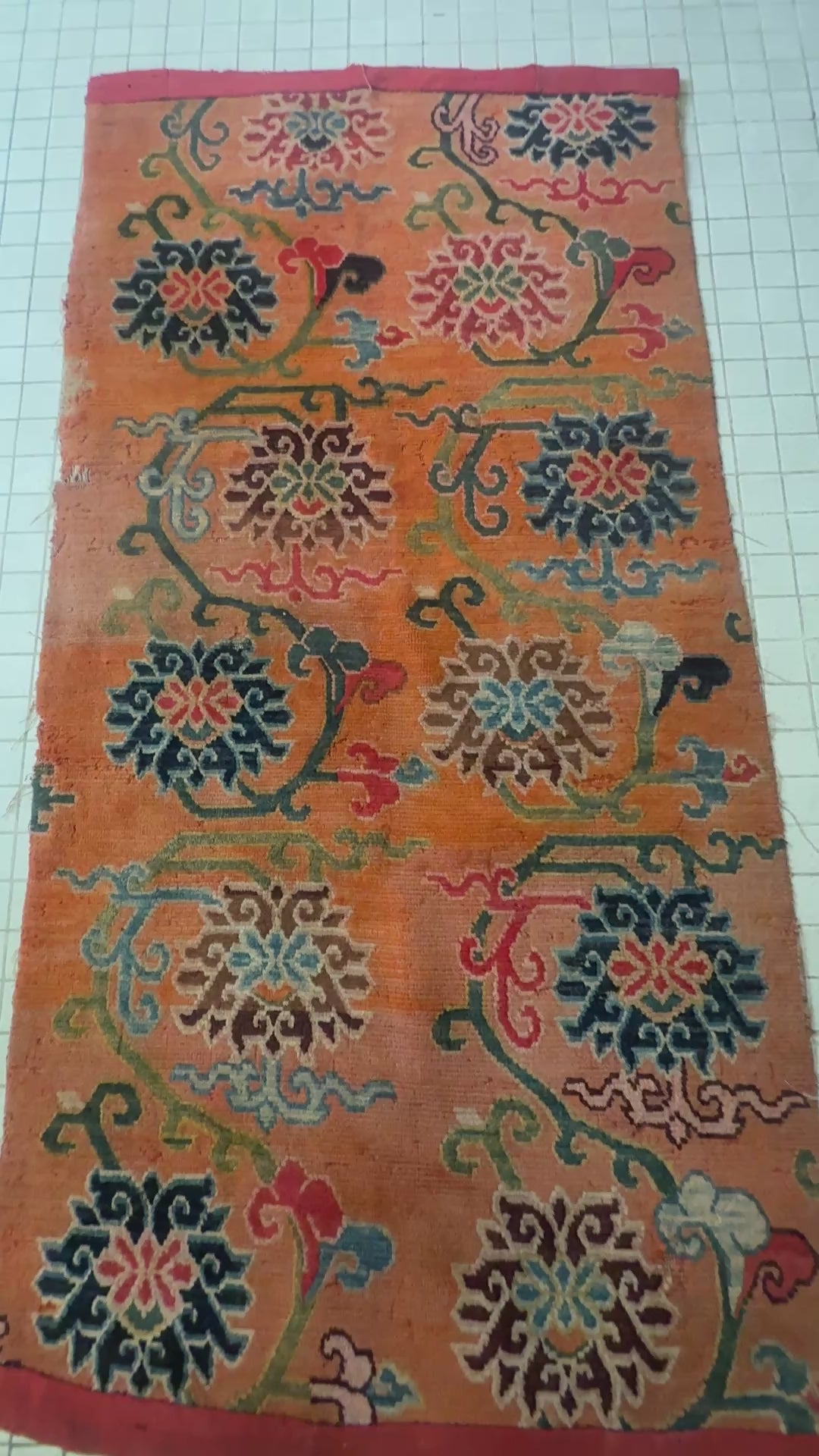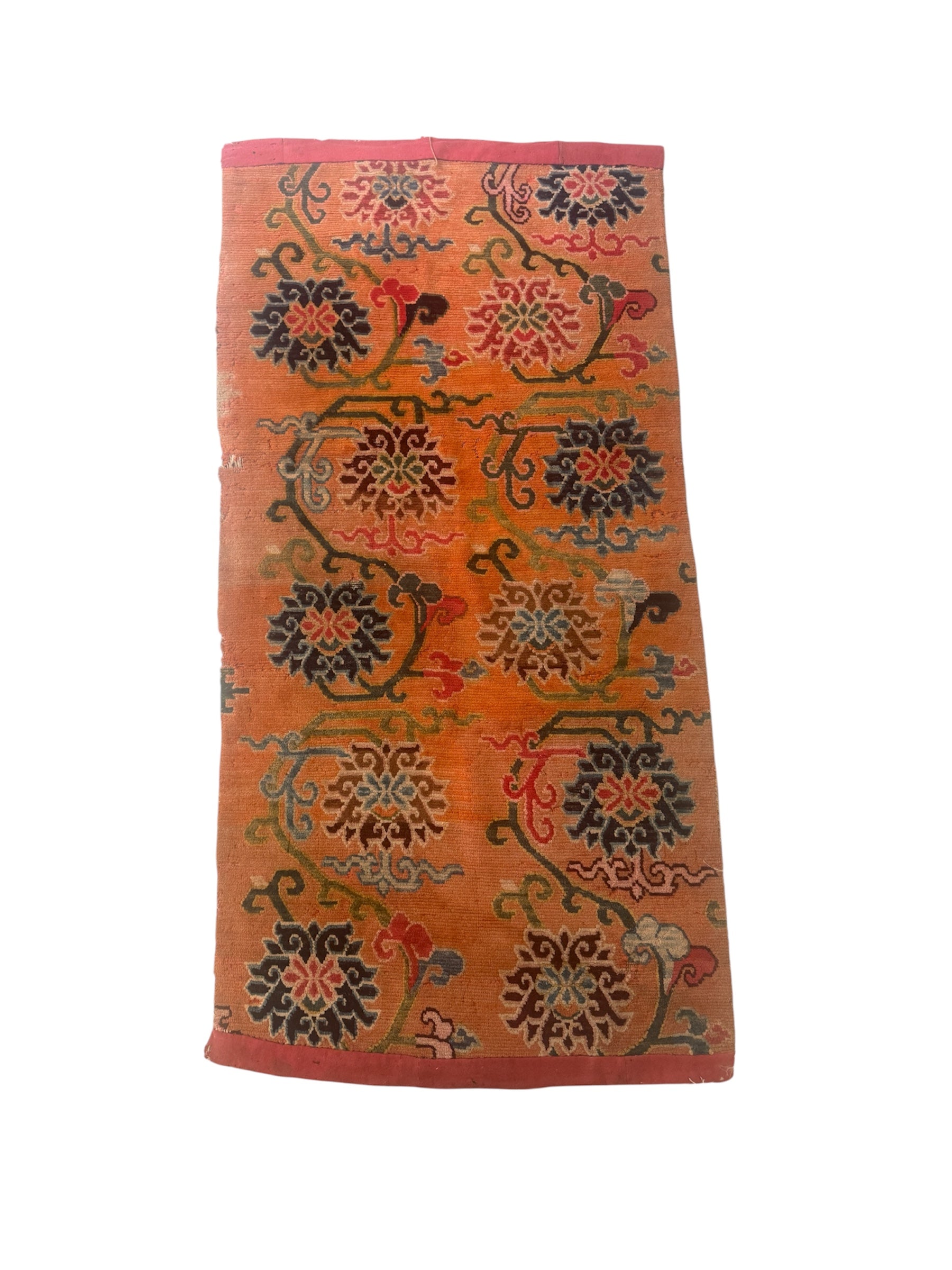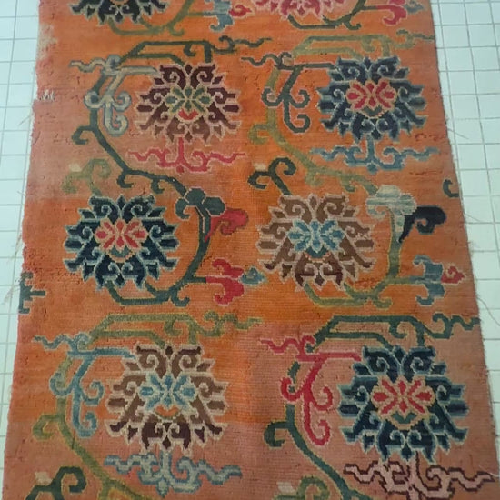 An early 20th C., Tibetan floral all wool rug - consisting of 12 lotus flowers. This rug is intact but has suffered loss of pile and wear at a number of areas and measures 31”x61”.