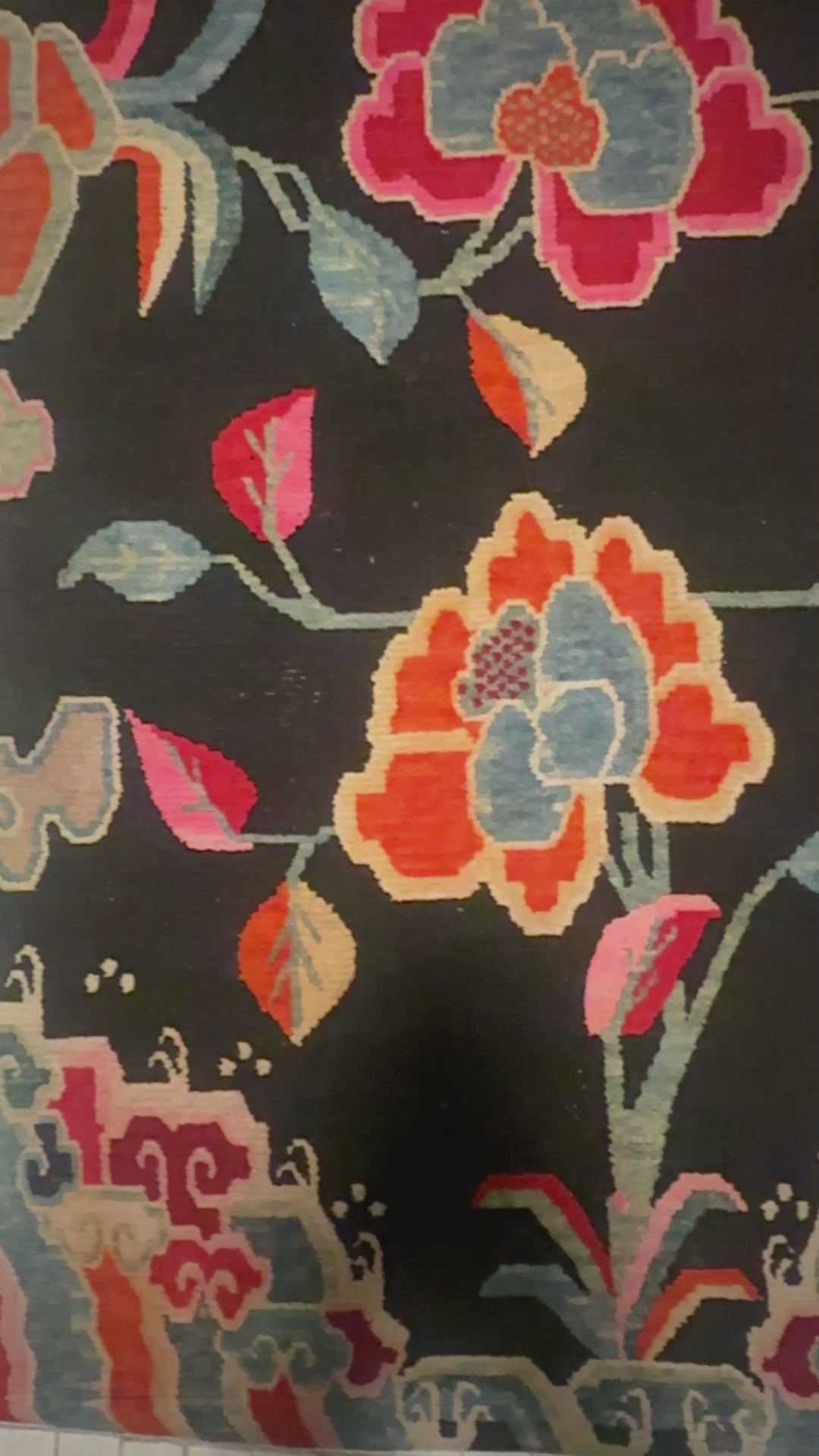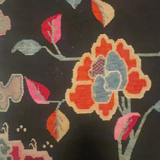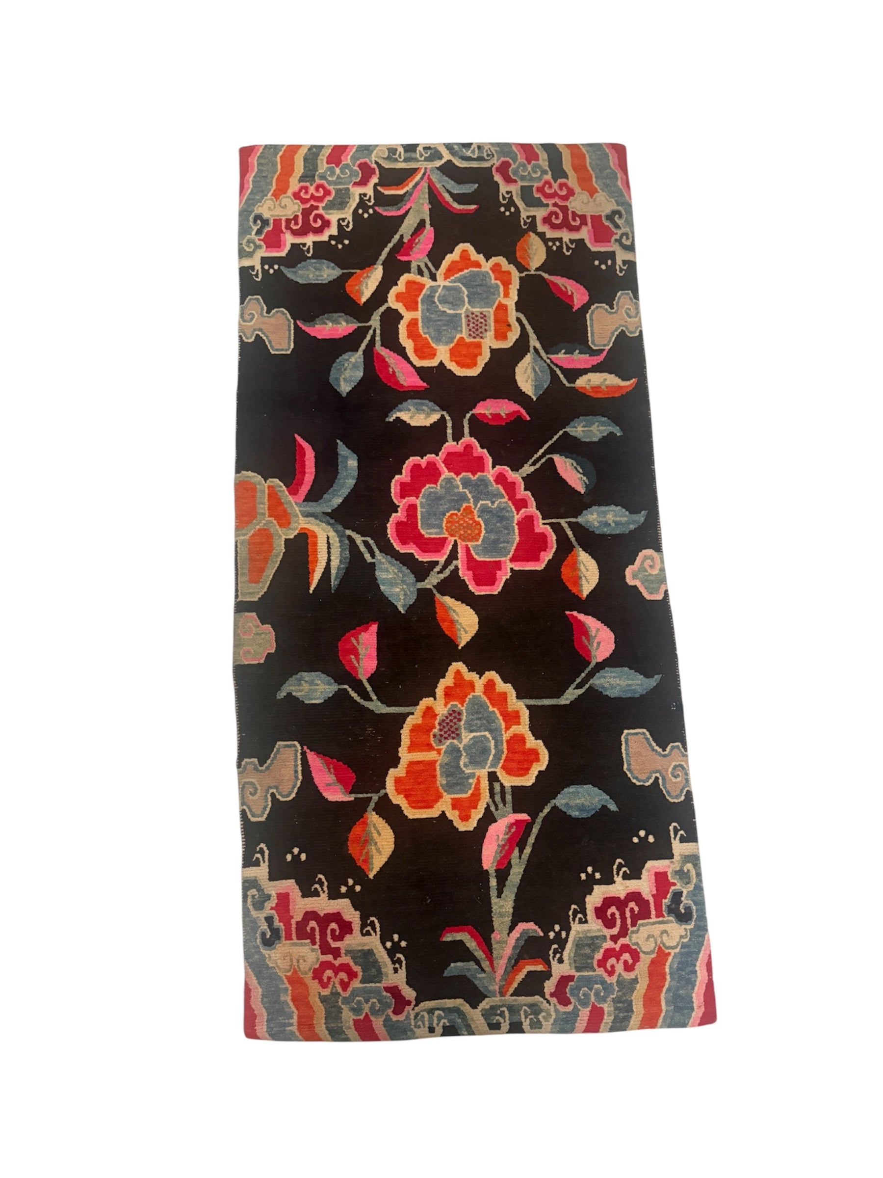 An early 20th C. Tibetan antique carpet with floral patterns and made in wool. The hot pink color used in rug became very popular in the turn of the century when chemical dyes from Europe hit the Asian -Indian markets. This rug with its predominantly black background was made for and used by the aristocracy and generally rarely seen in the commercial arena. The rug measures 35”x 74”.