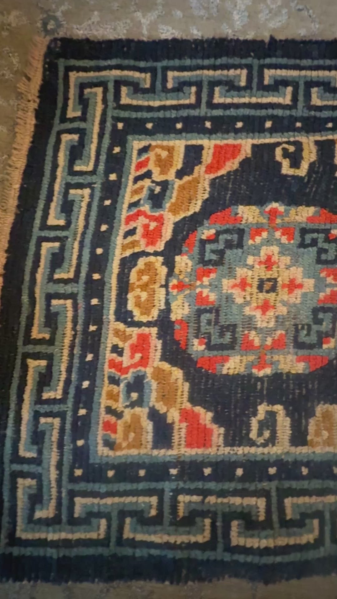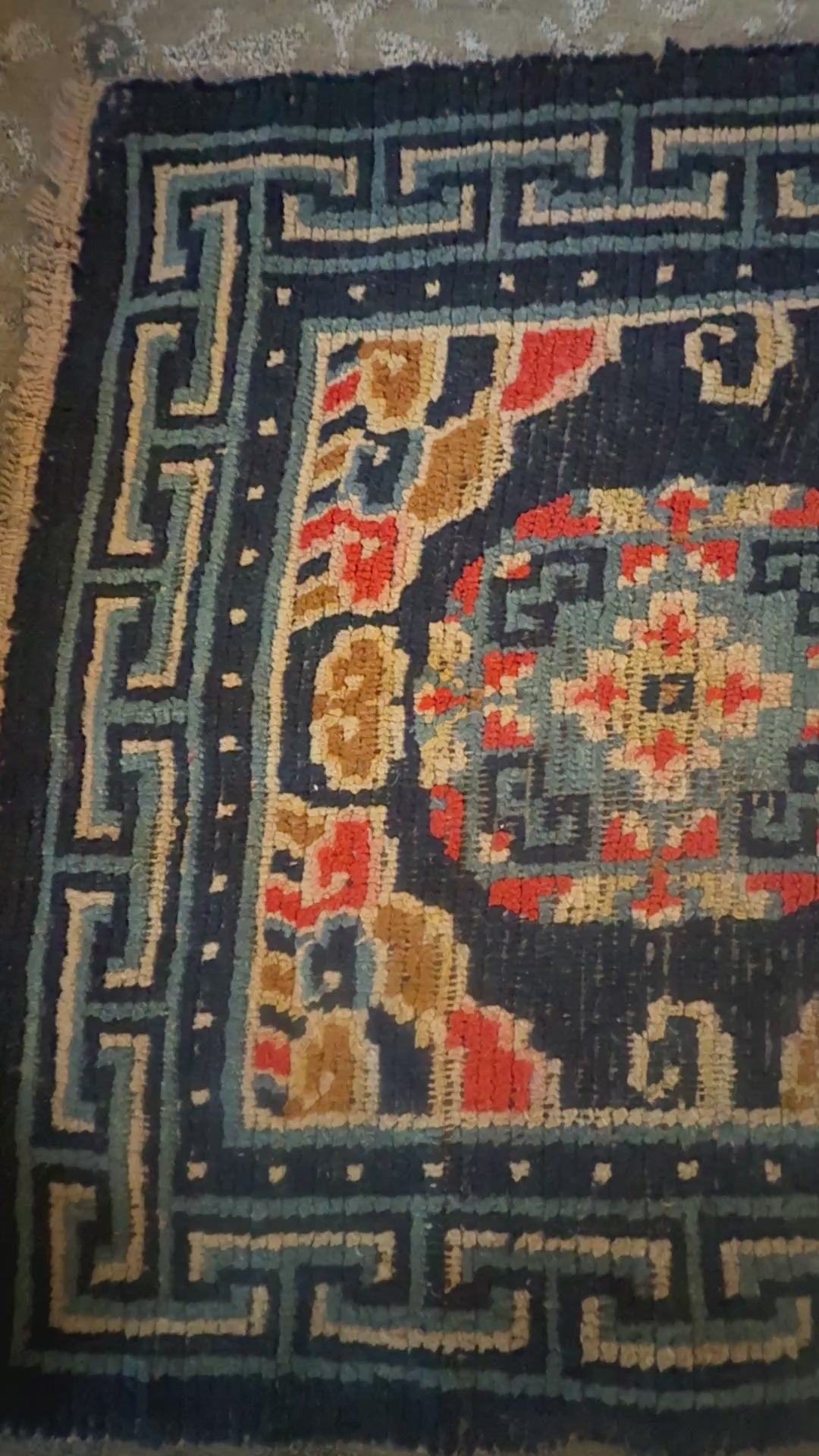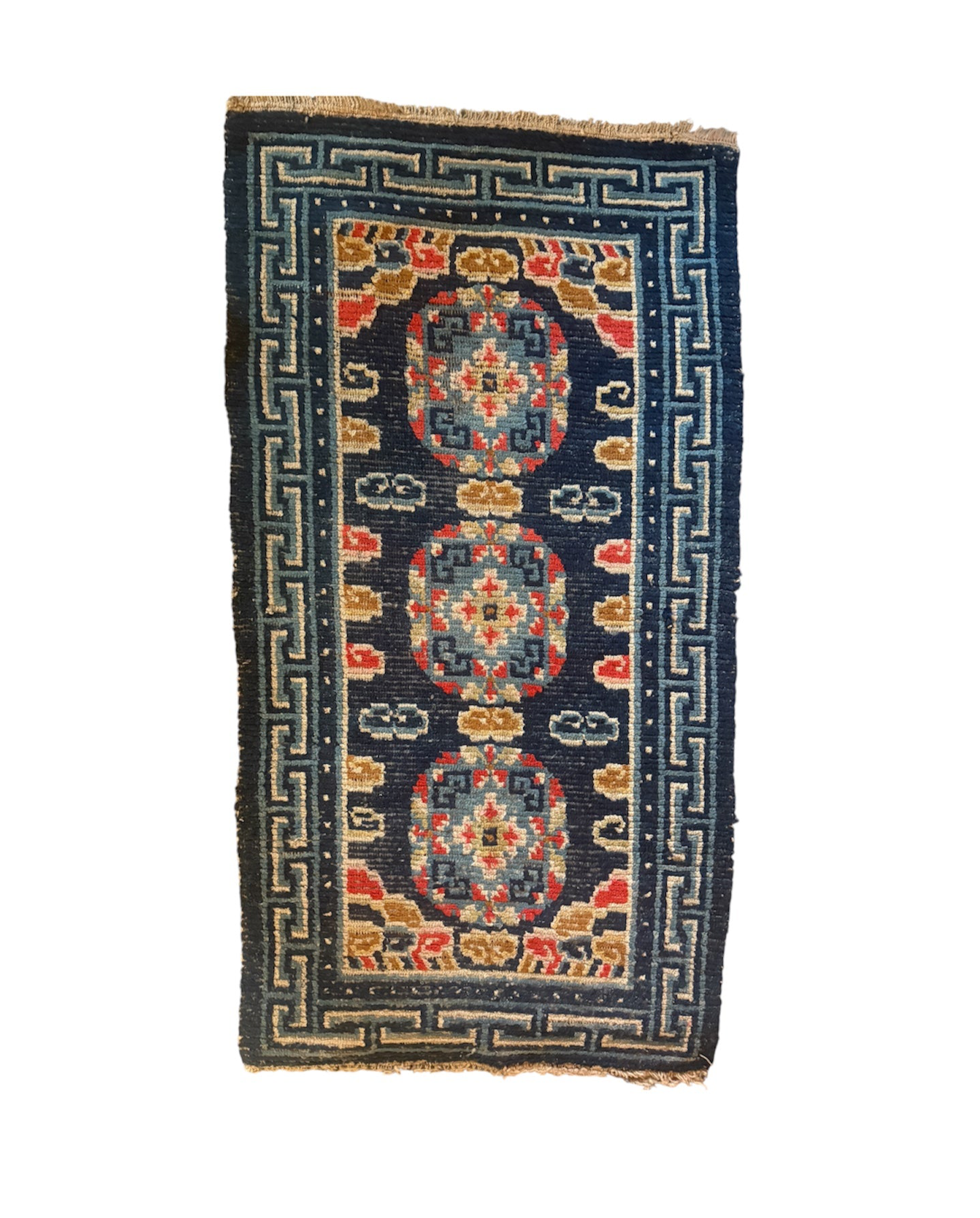 L my An antique Tibetan woolen rug measuring 29”x49” consisting of a geometric border with the center of the rug being occupied by 3 floral medallions and cloud motifs. The rug is in good condition .