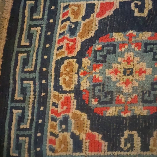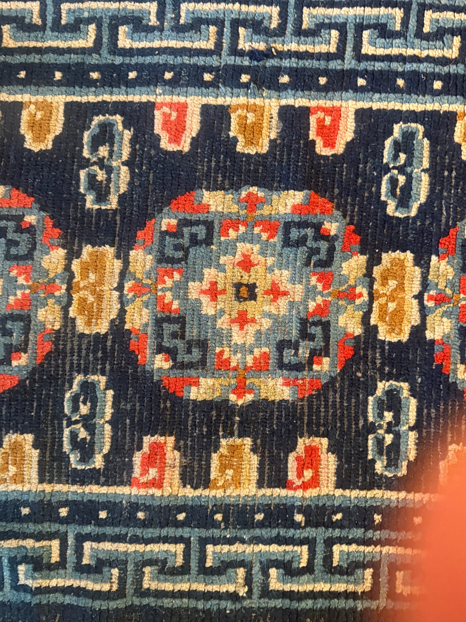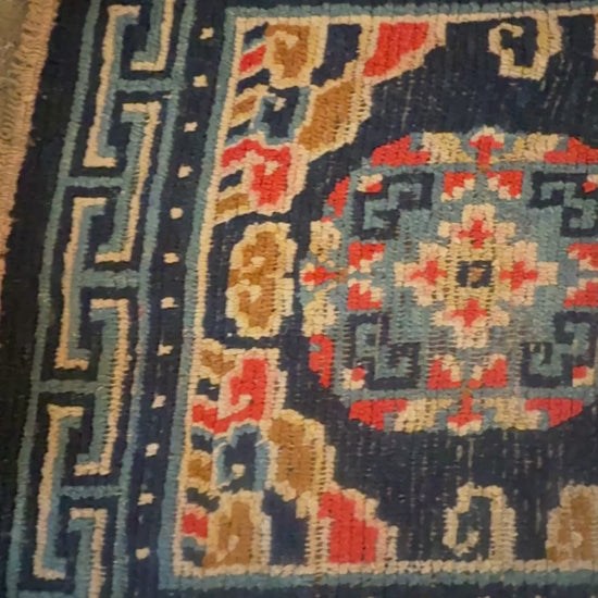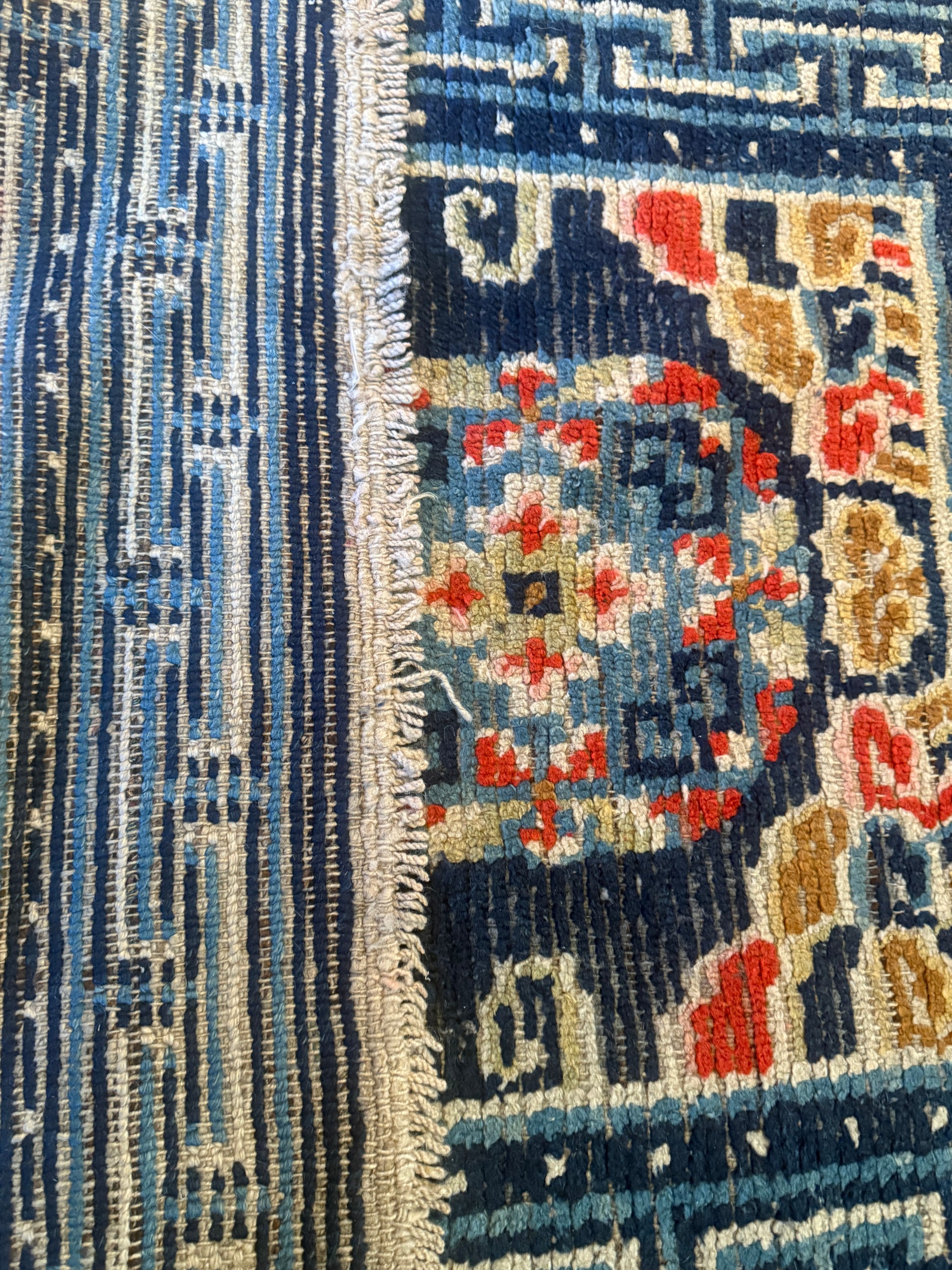 L my An antique Tibetan woolen rug measuring 29”x49” consisting of a geometric border with the center of the rug being occupied by 3 floral medallions and cloud motifs. The rug is in good condition .