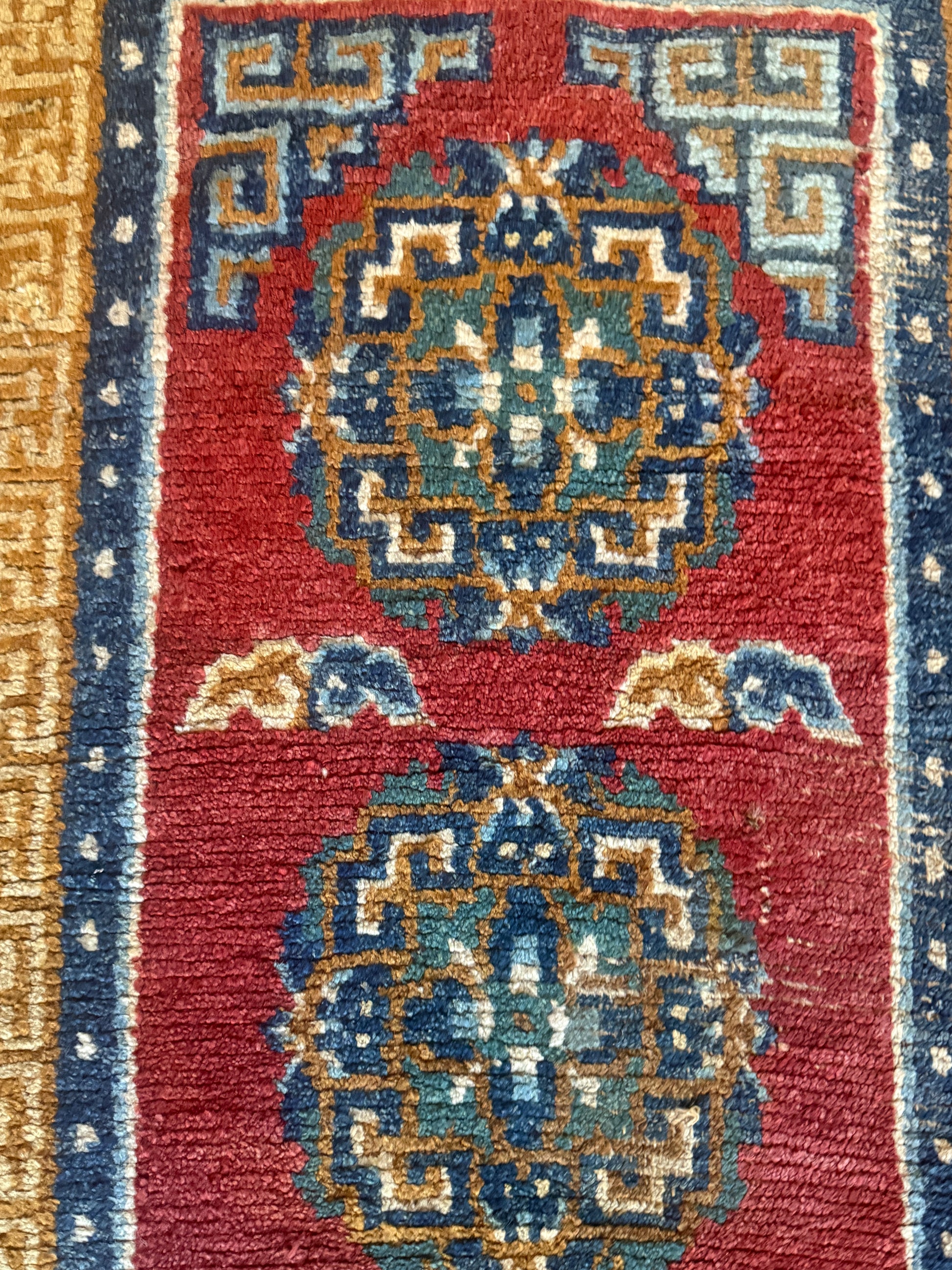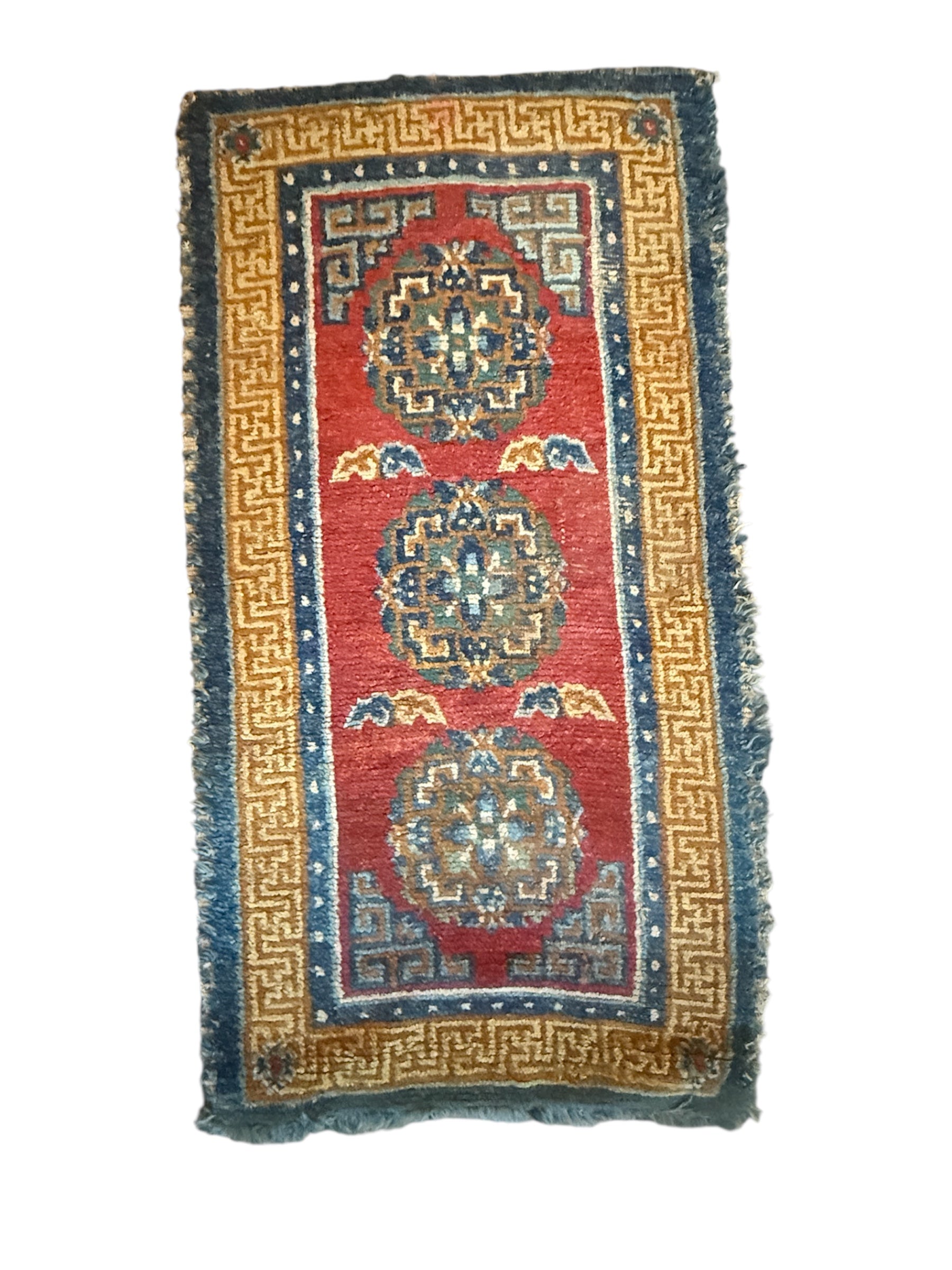 An antique Tibetan woolen rug measuring 30”X57”consisting of a geometric border with the center of the rug being occupied by 3 floral medallions and cloud motifs. The rug is in good condition . The rug is designed with a frayed fringe .