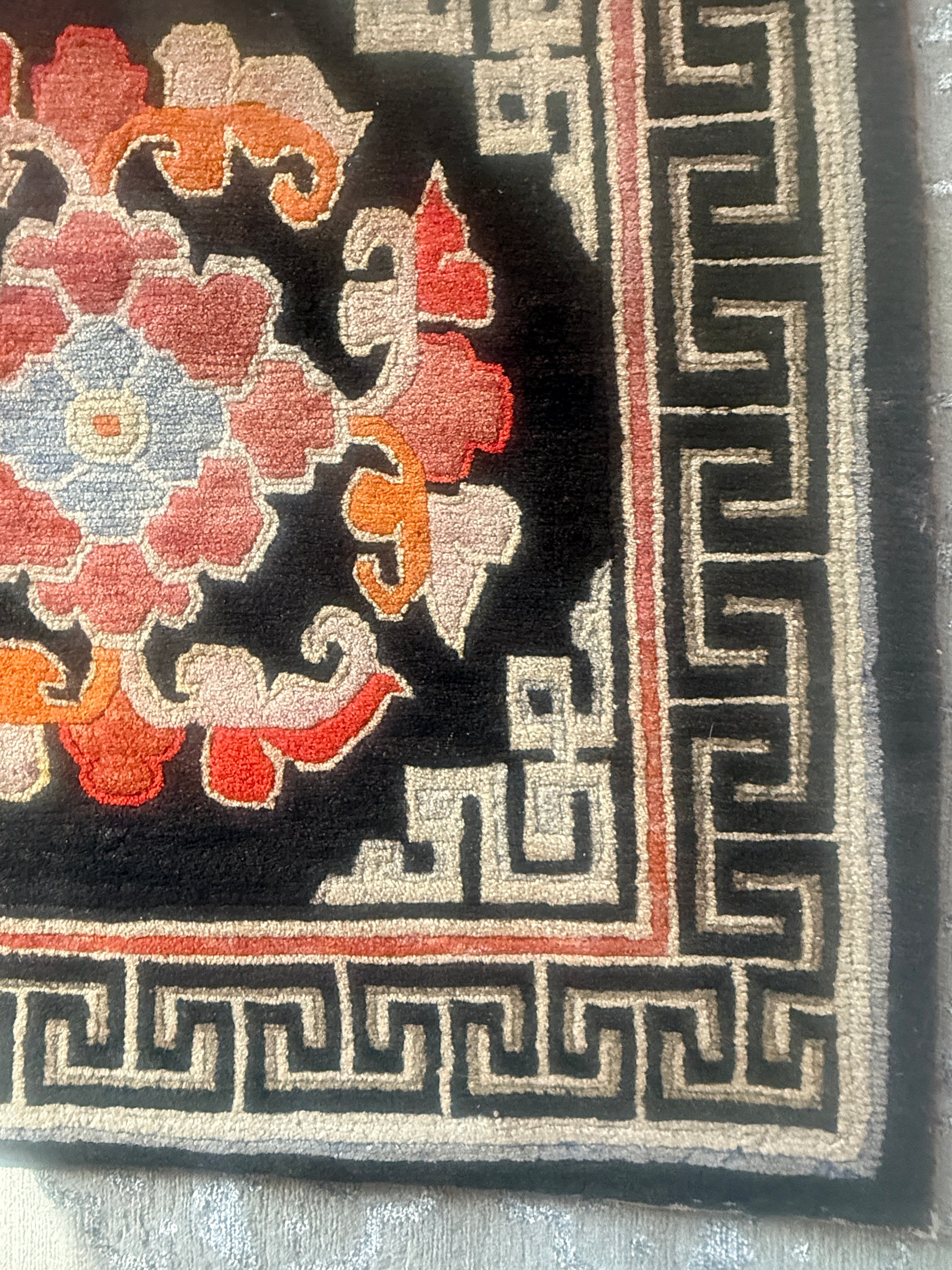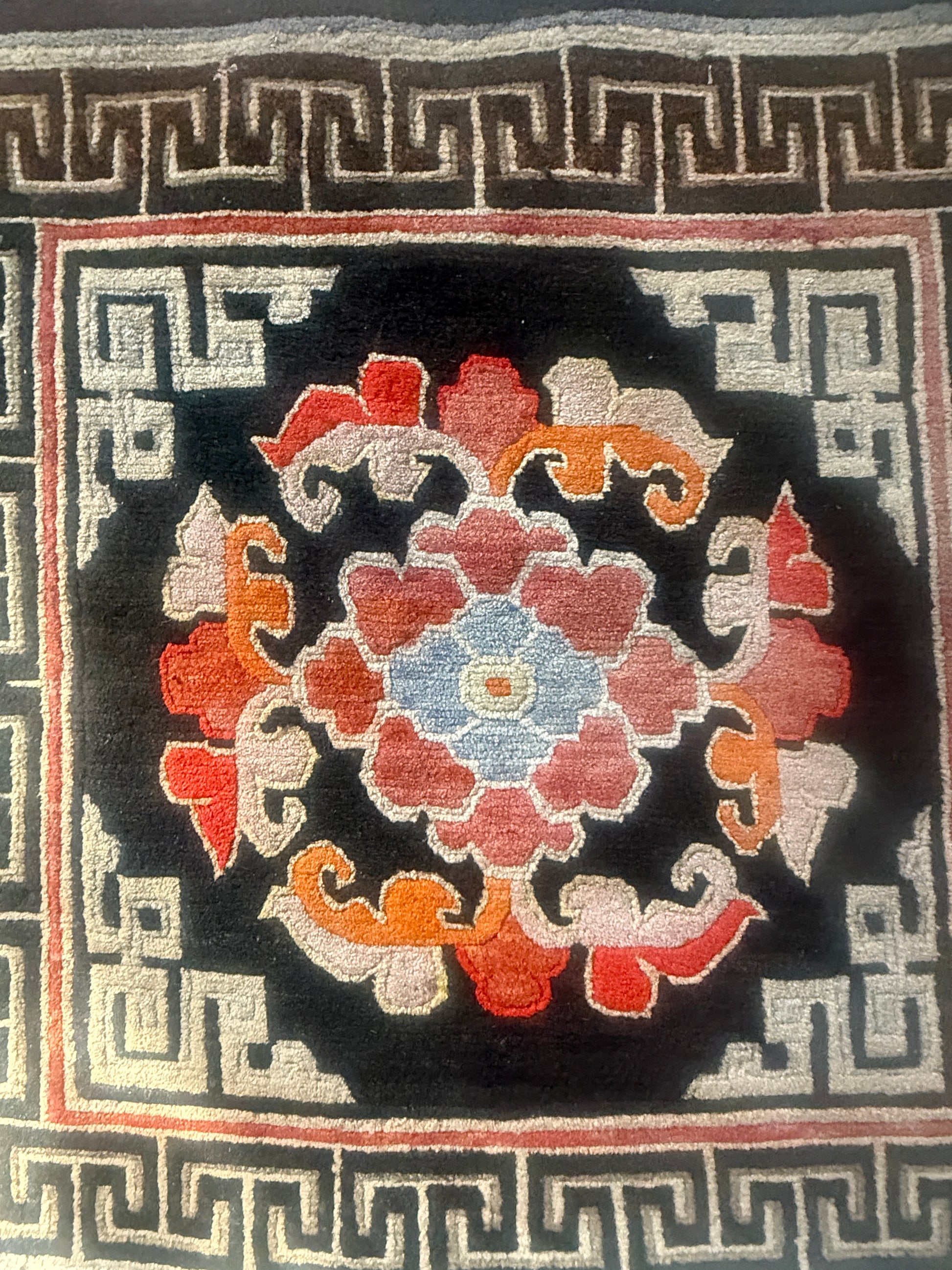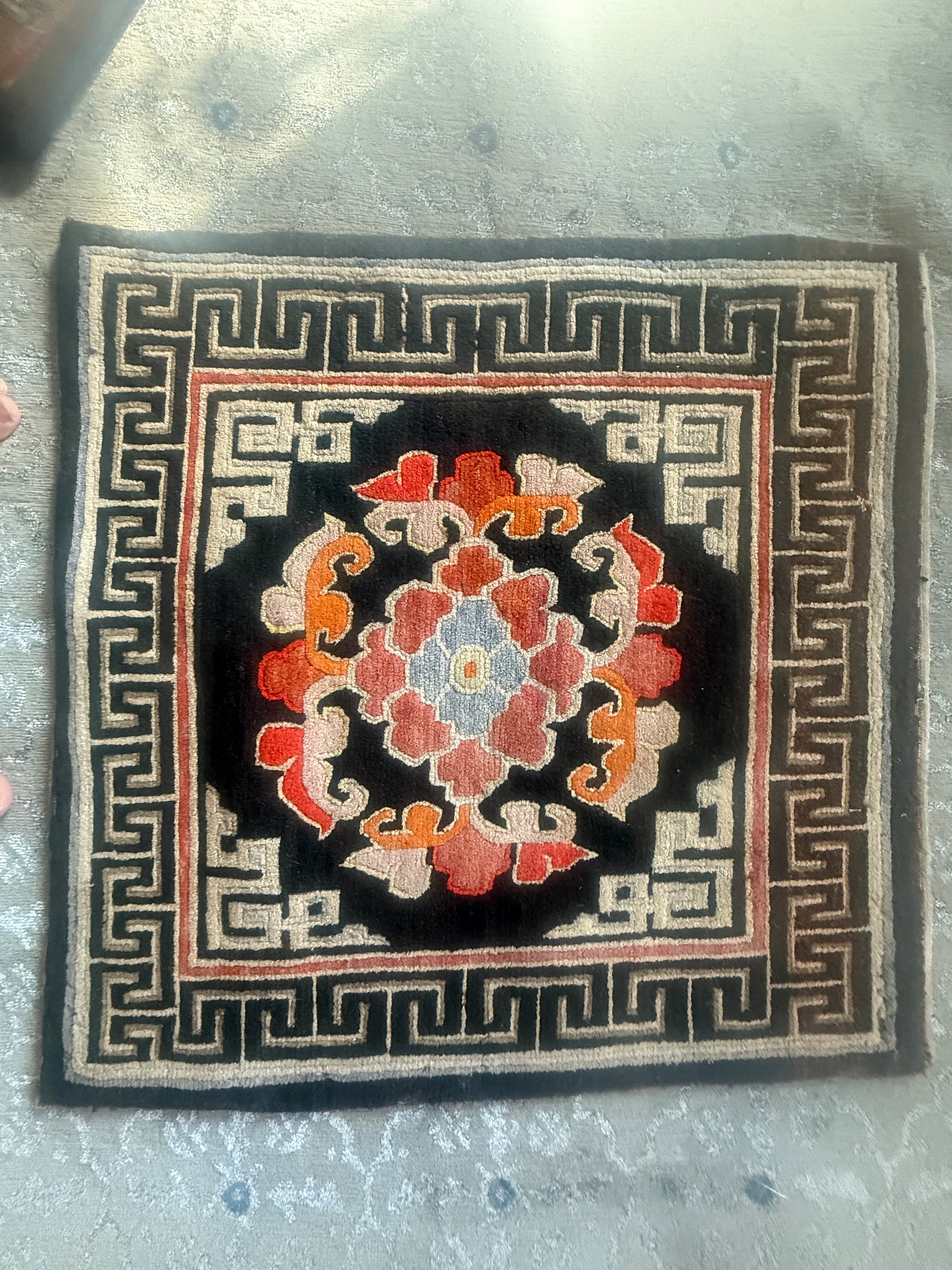 A antique Tibetan throne seat, from the mid 20th C. In good condition, made of wool and with a gray/ black background. The rug has a central a flower motif that is framed by a geometric border. The rug measures 34”x35”and is oversized for a chair. The size of the rug and the attention to detail and artistry of the rug suggests that it was used probably as a throne seat cover.