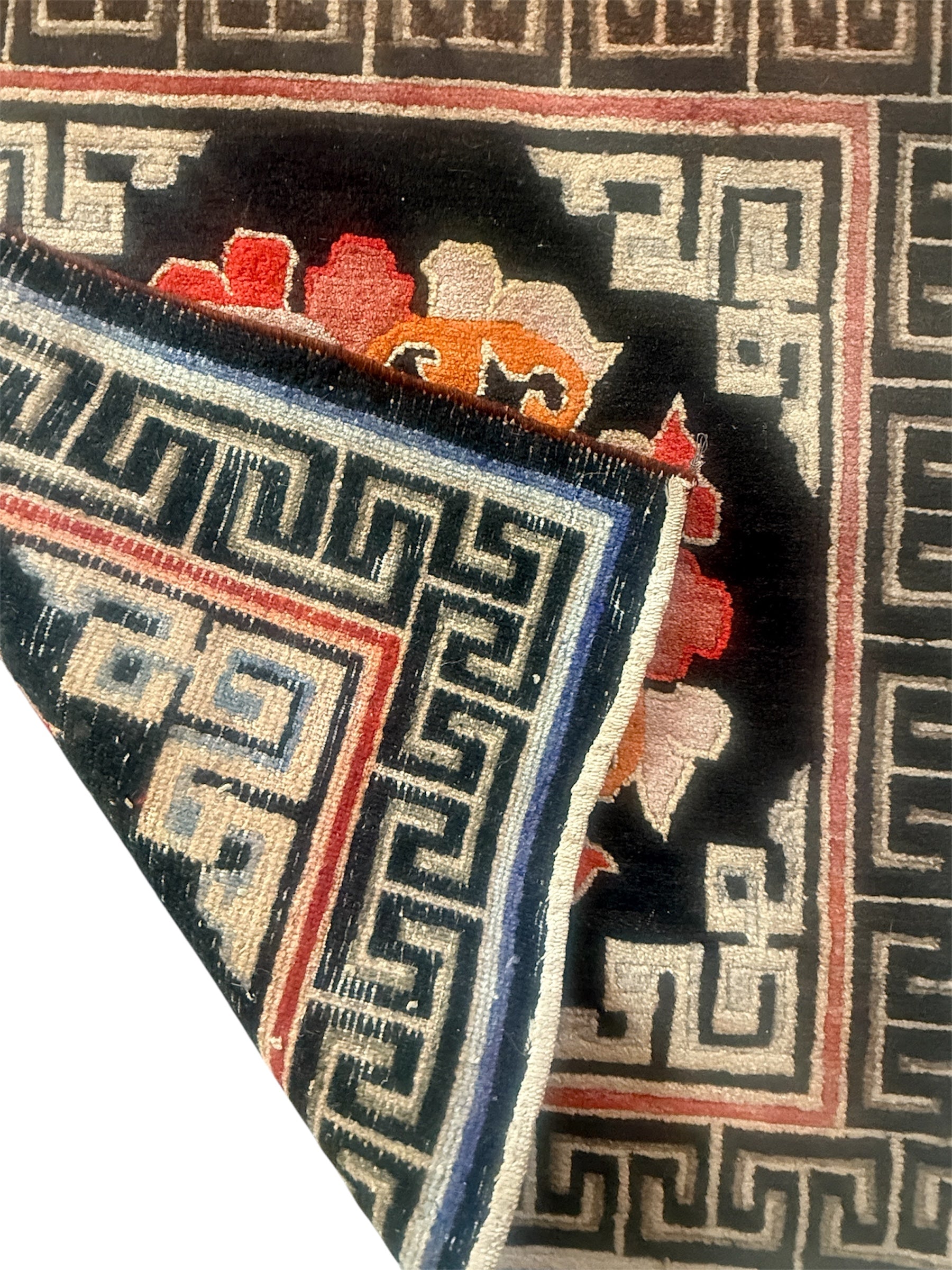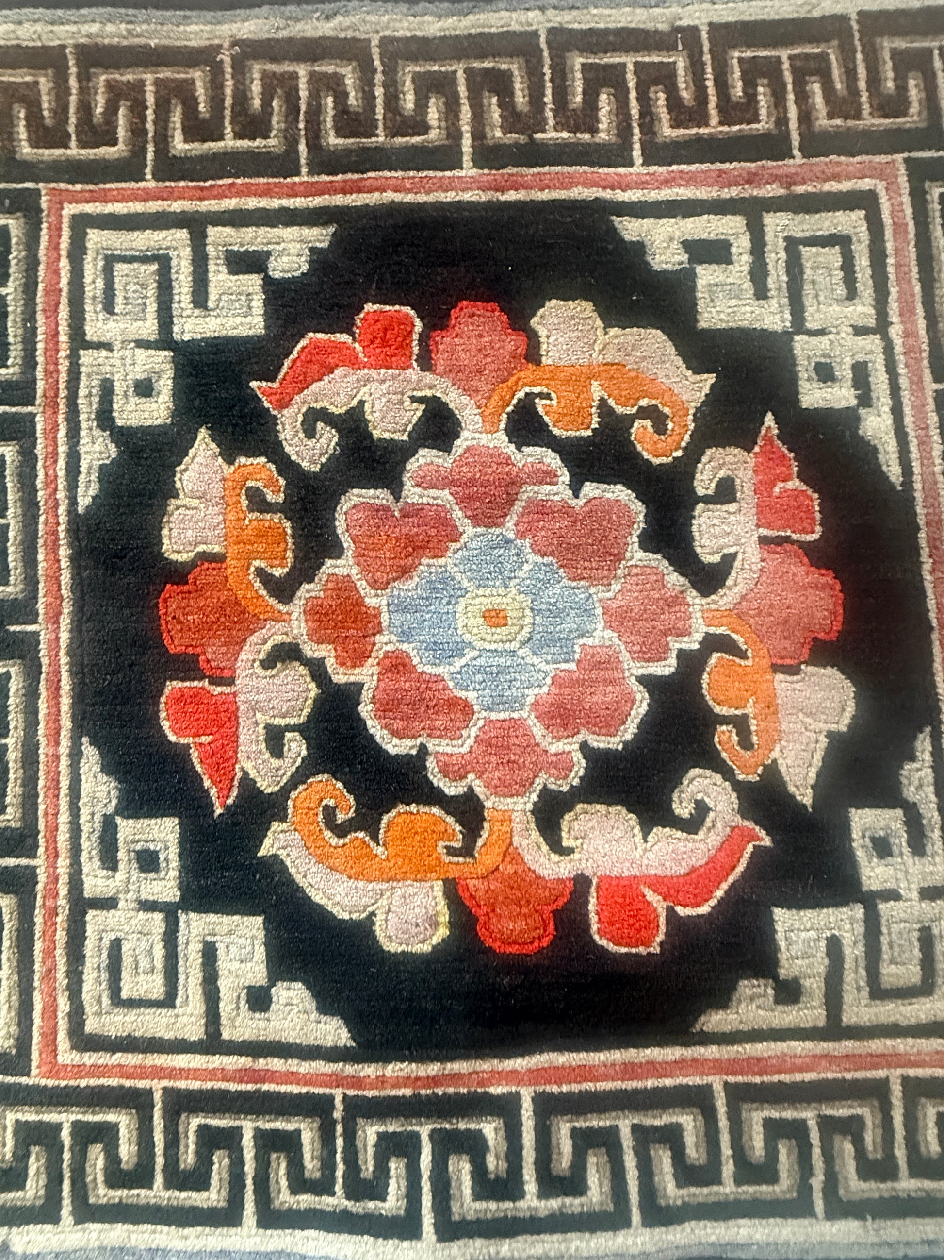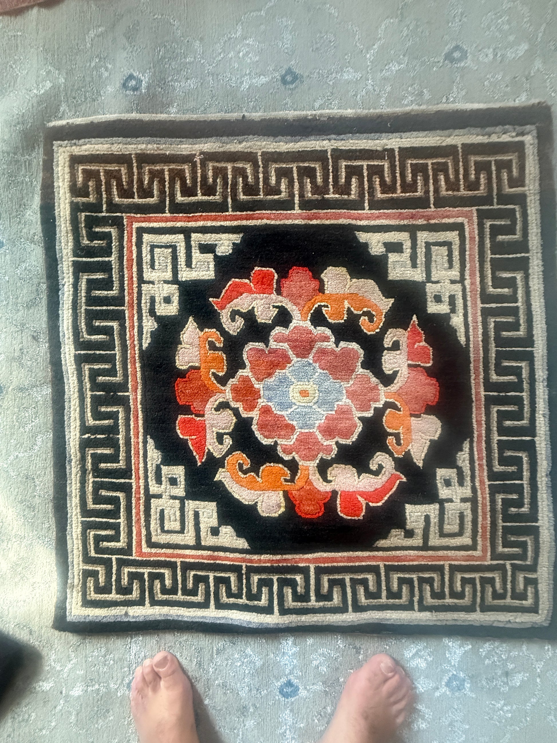 A antique Tibetan throne seat, from the mid 20th C. In good condition, made of wool and with a gray/ black background. The rug has a central a flower motif that is framed by a geometric border. The rug measures 34”x35”and is oversized for a chair. The size of the rug and the attention to detail and artistry of the rug suggests that it was used probably as a throne seat cover.