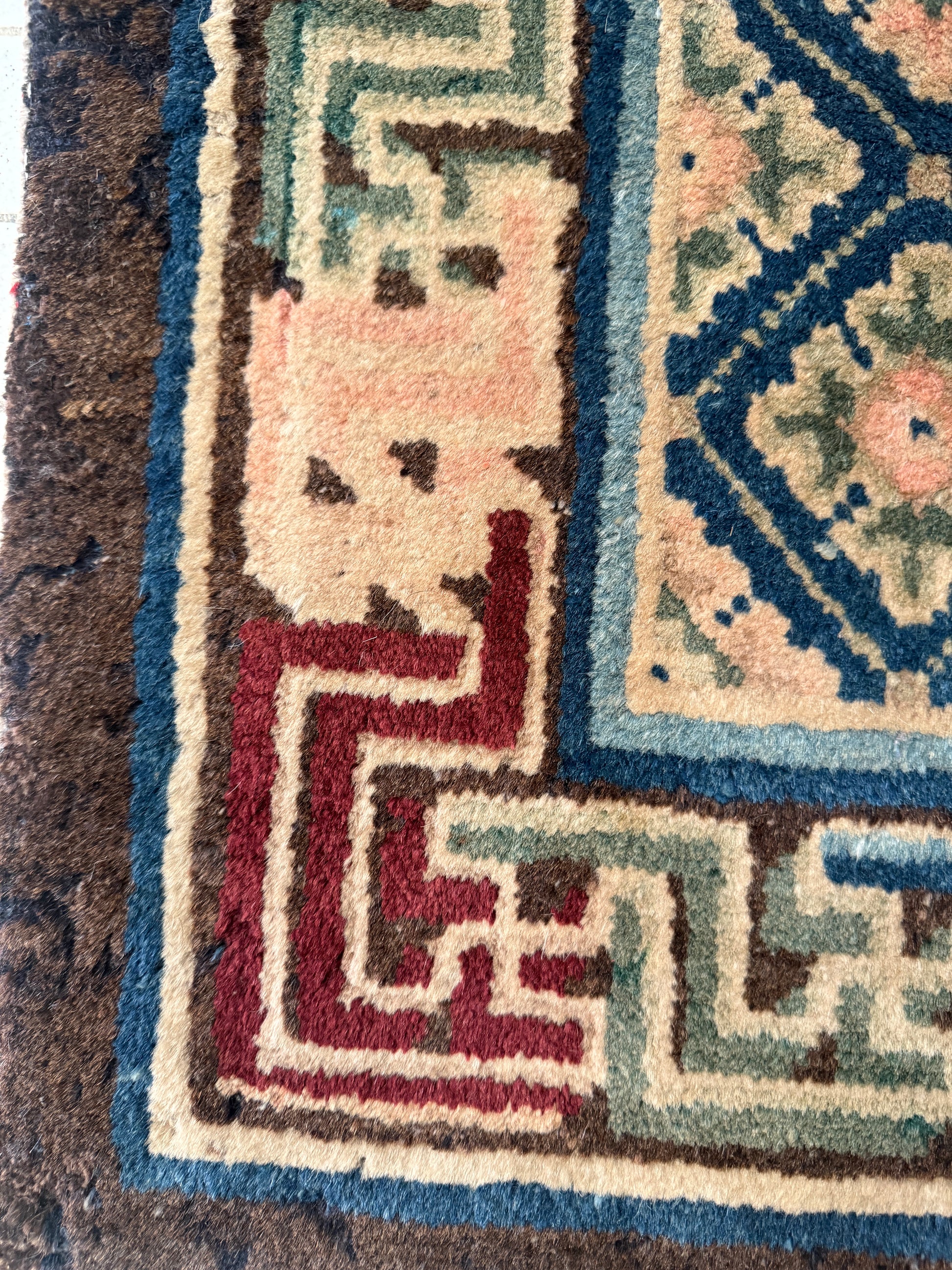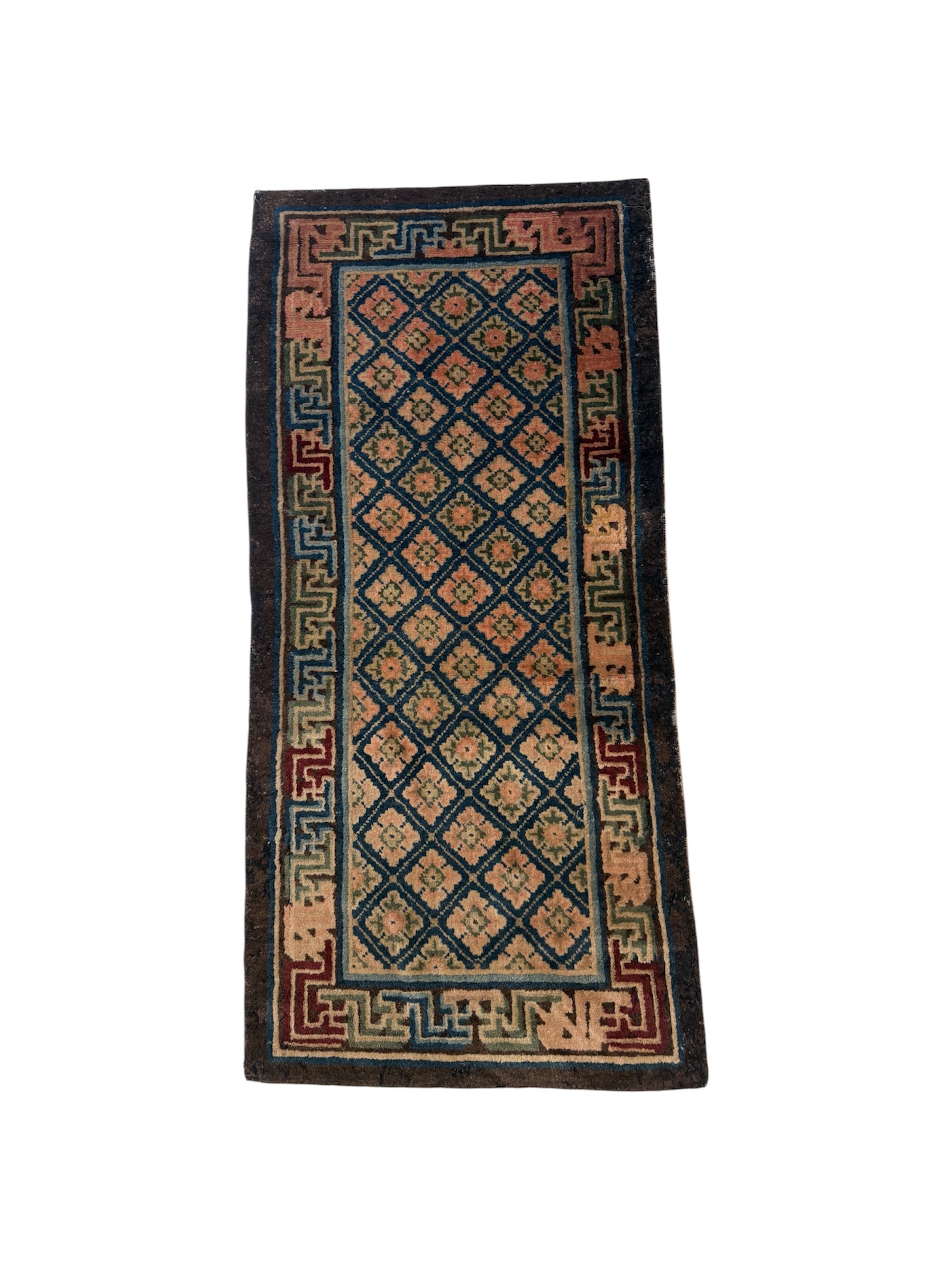Early 20th C. Tibetan rug with wool and cotton, designed with a geometrical border and floral motifs arranged in a trellis like design. With a brown base color at the corner and a navy central base , the floral motifs in pink and green give it a subtle burst of color. The rug measure 28”x58”, The rug is intact but has sections that have been damaged j the past.