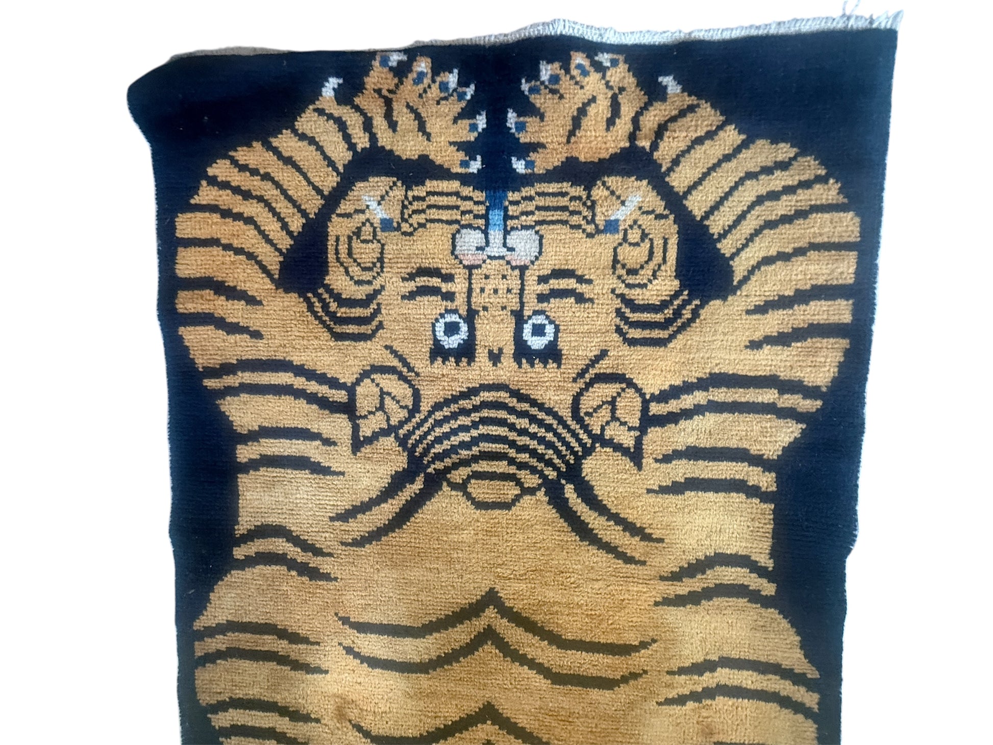 A antique  baotao tiger  rug - from the early  part of the  20th Century, made of wool. The rug is made with two colors - deep blue and yellow, the rug’s background and the tiger stripes are in deep blue and the body of the tiger in yellow.
