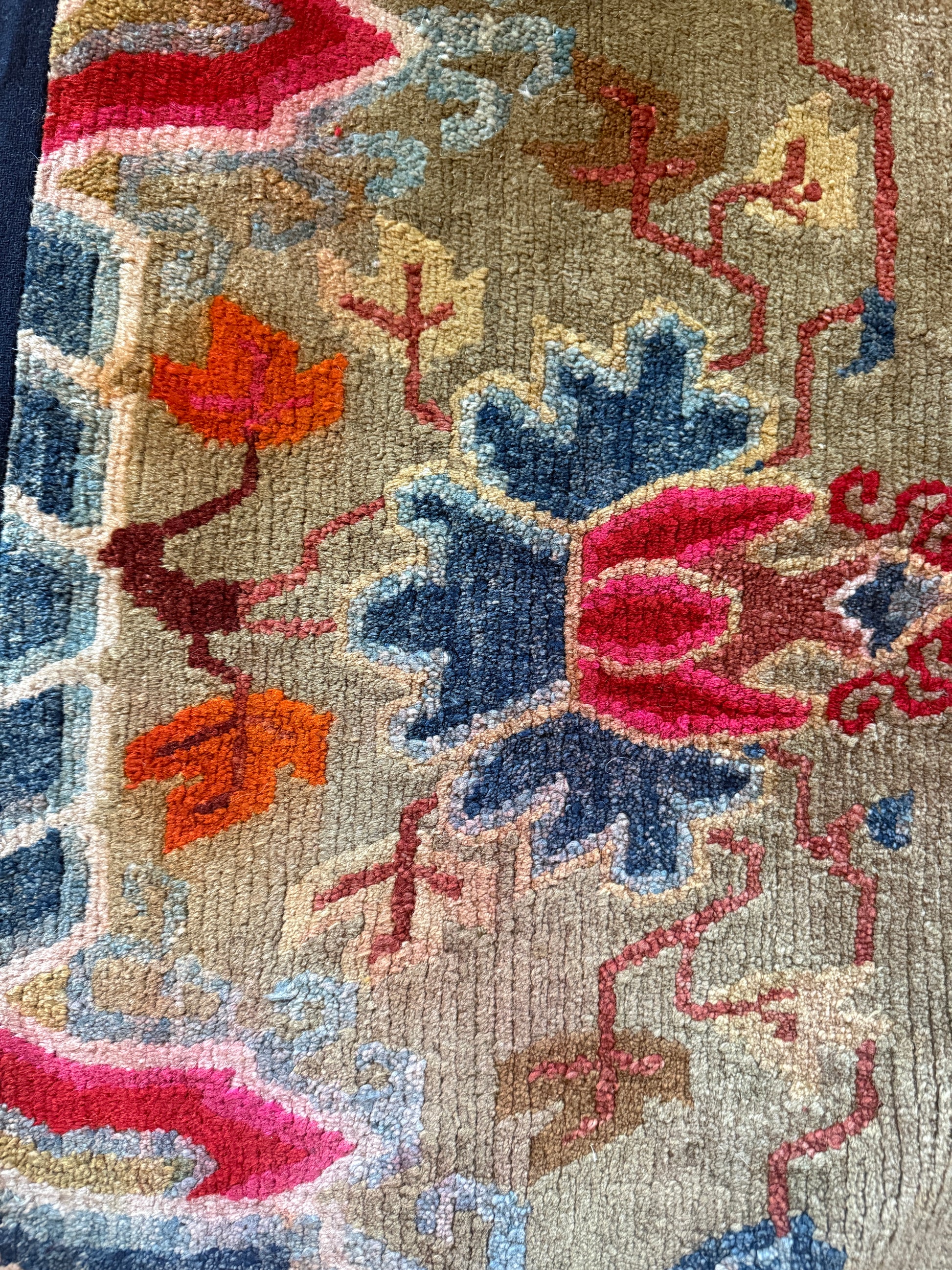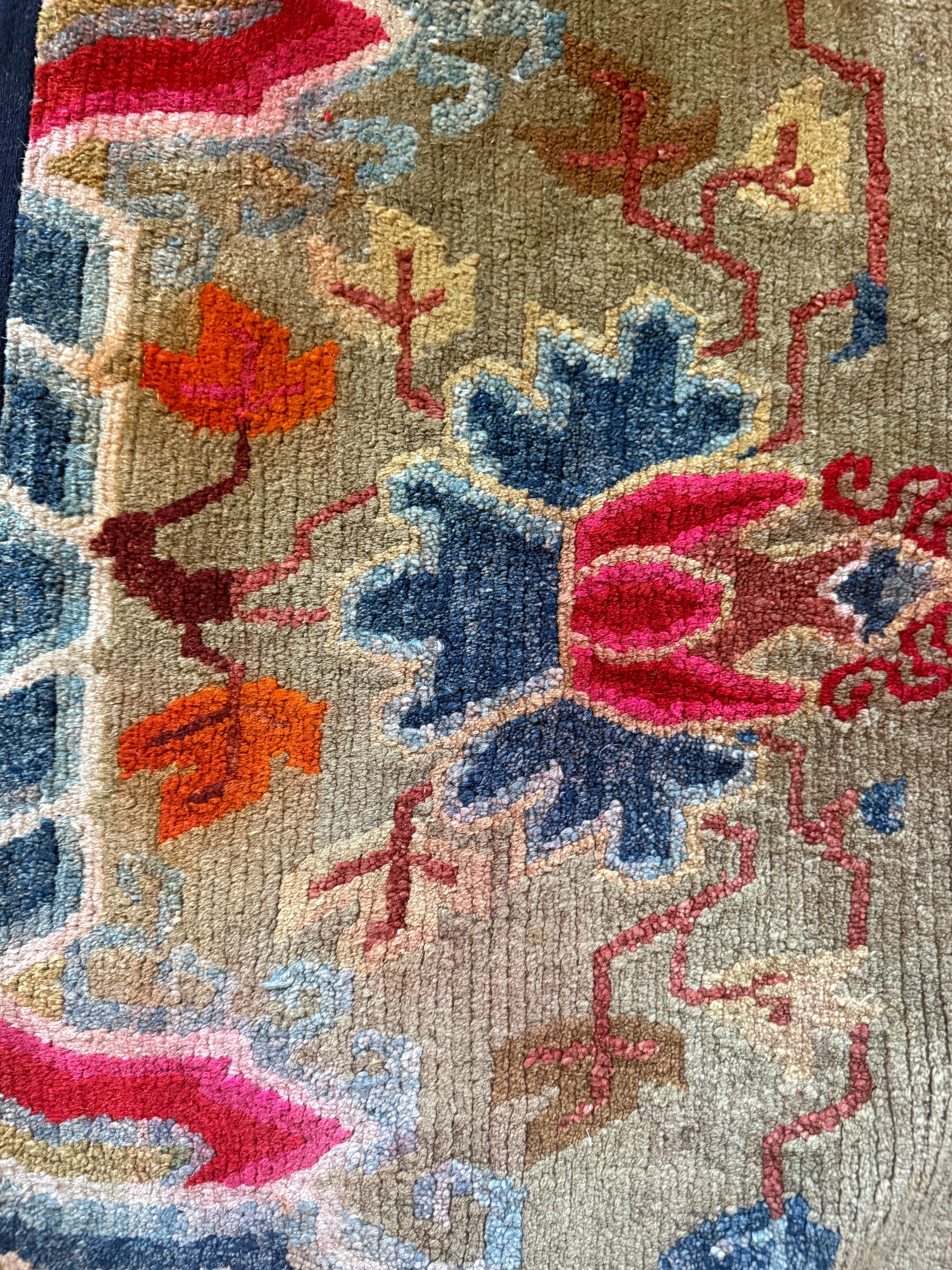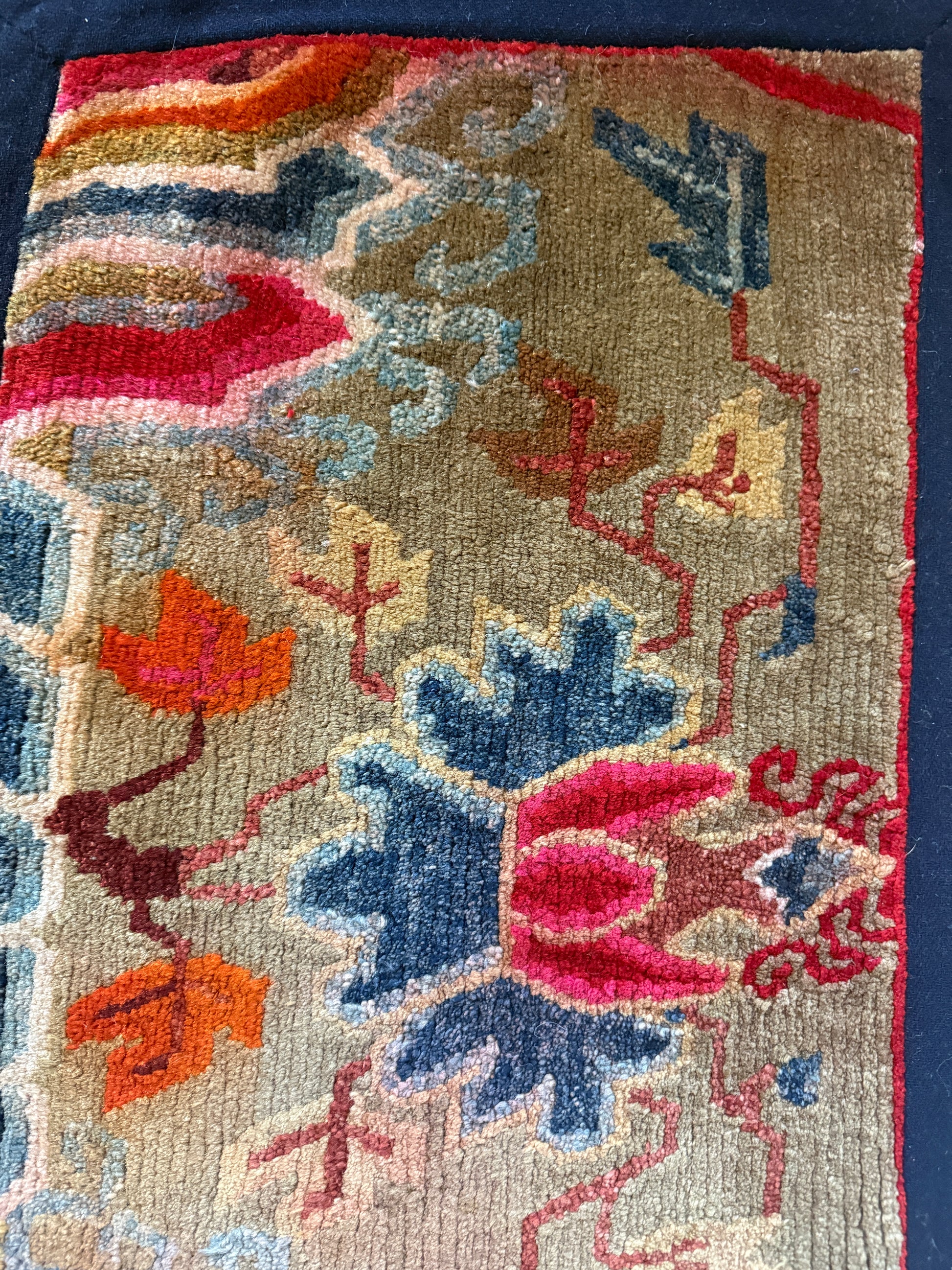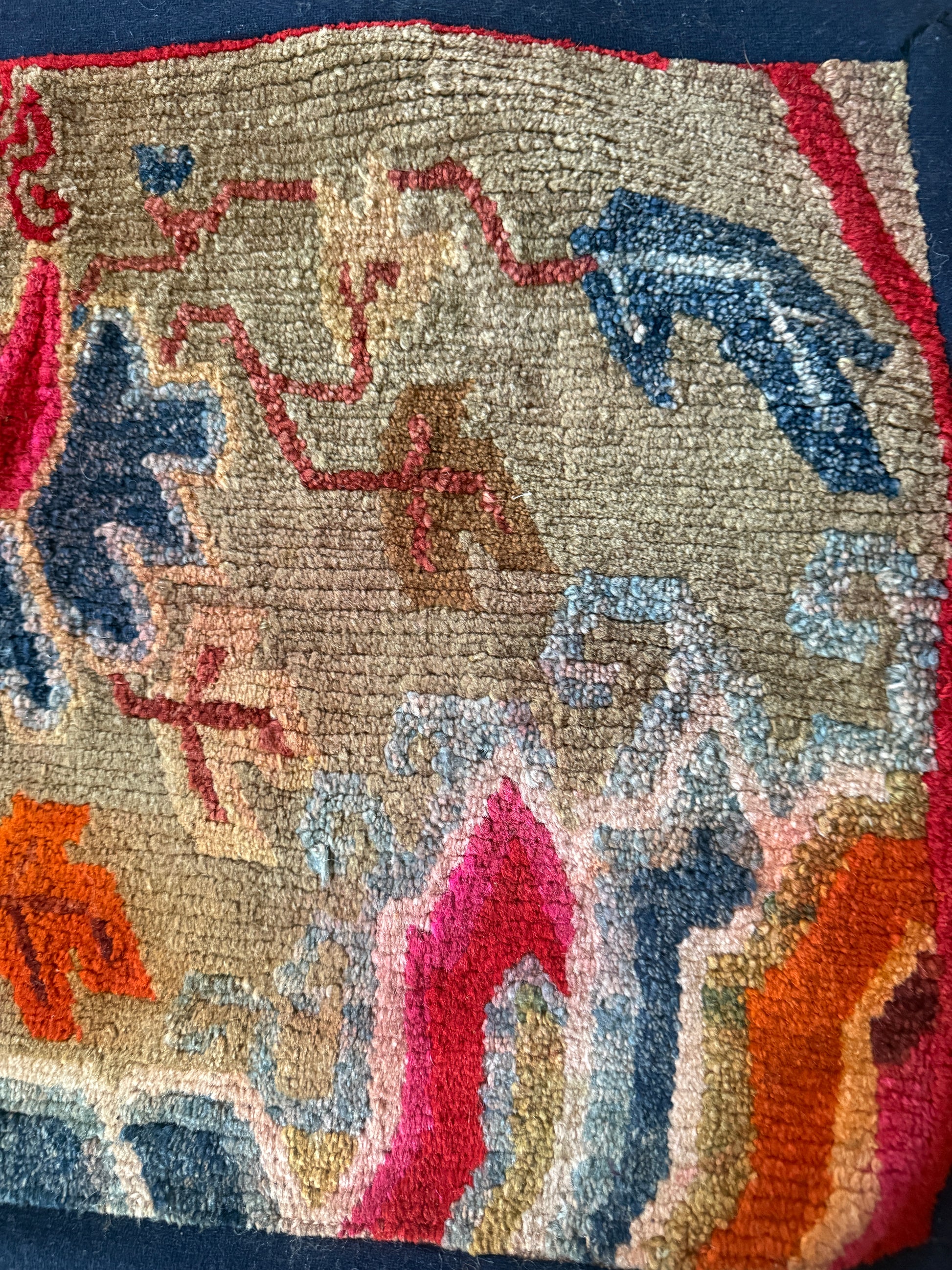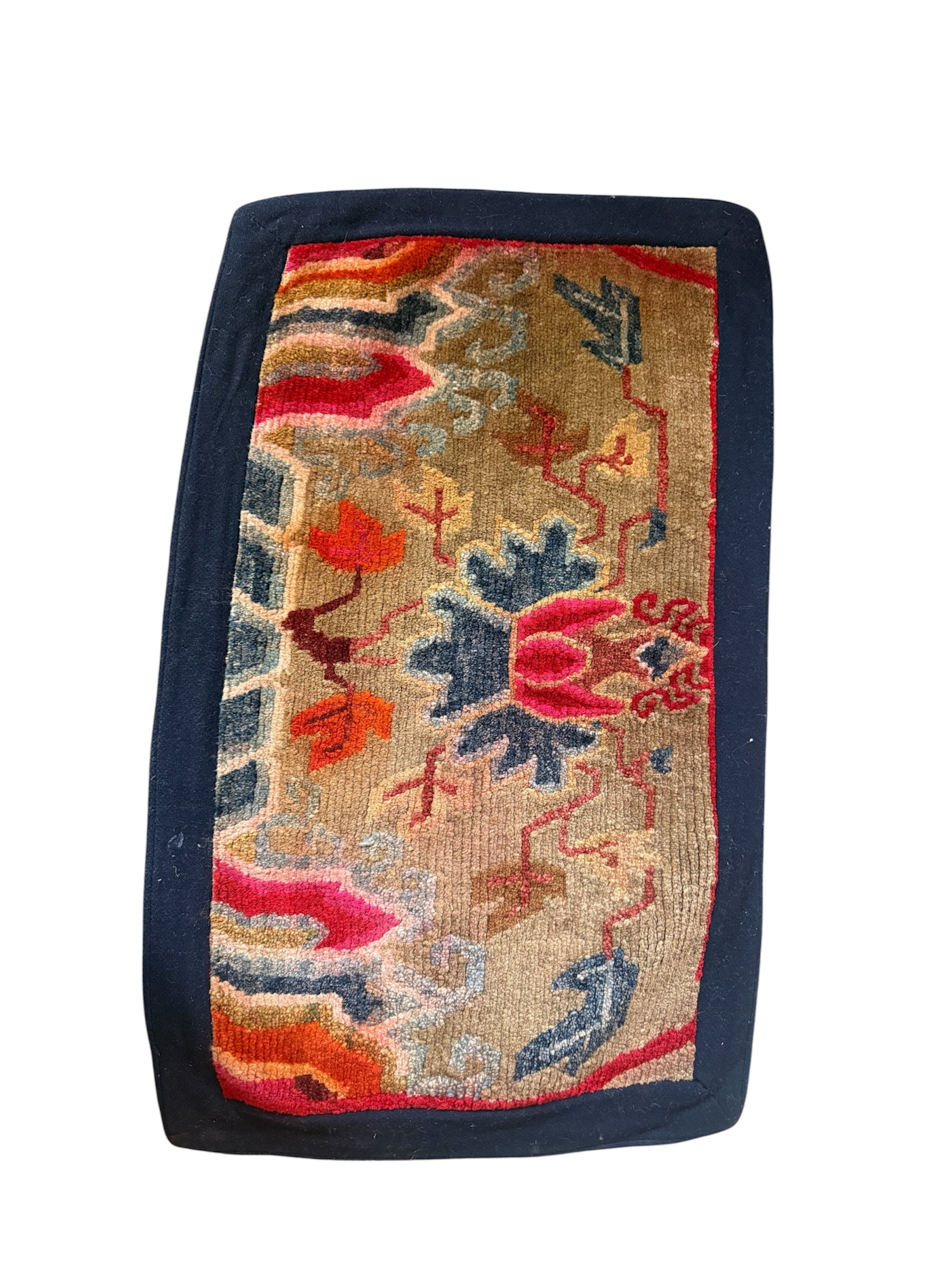 A antique Chinese seat rug - from the early part of the 20th Century, made of wool -the rug has a border with multicolored waves and clouds and a central panel with a medallion with two birds, the medallion is flanked by flowers on the each side . The rug measures 31””x19”.