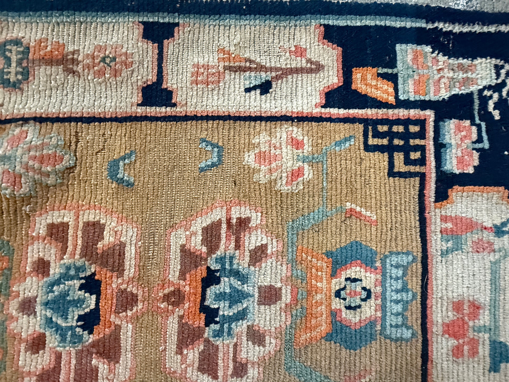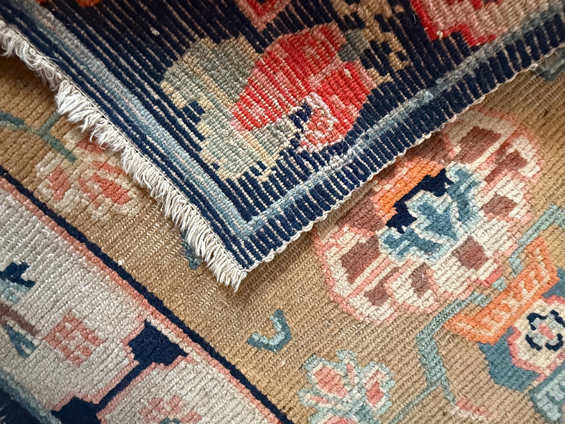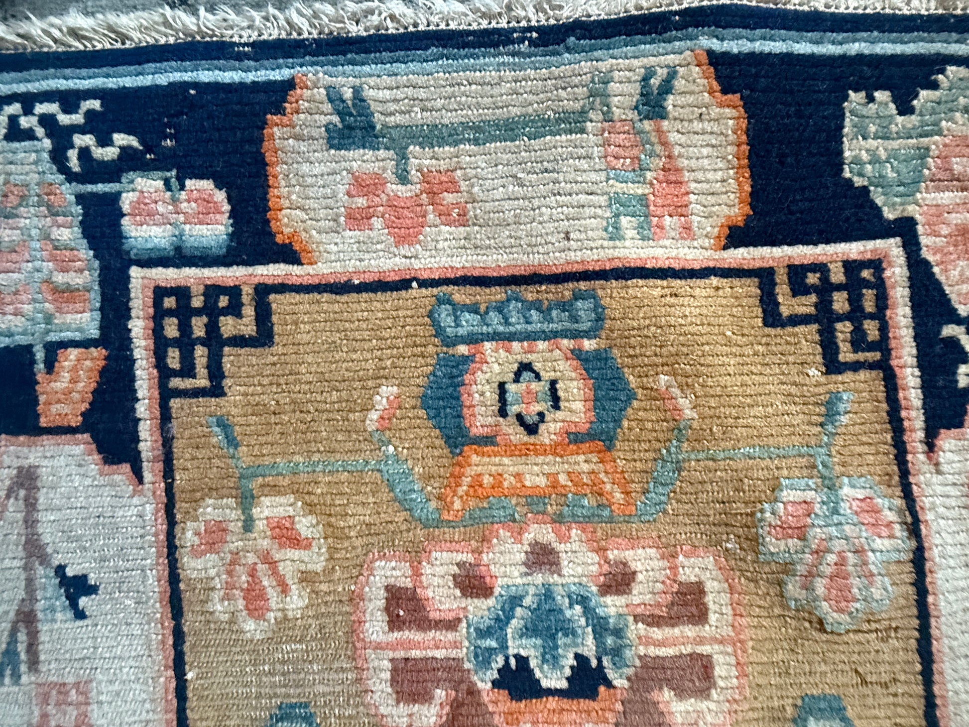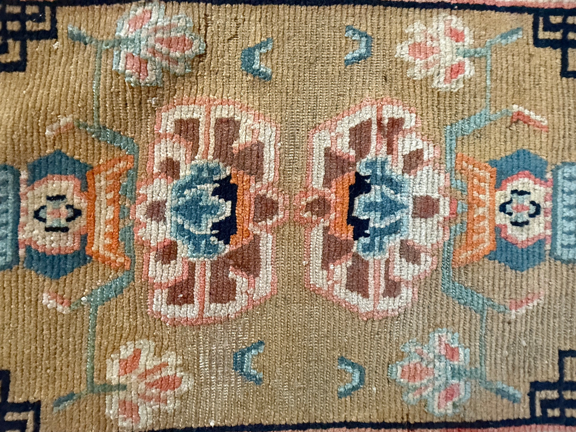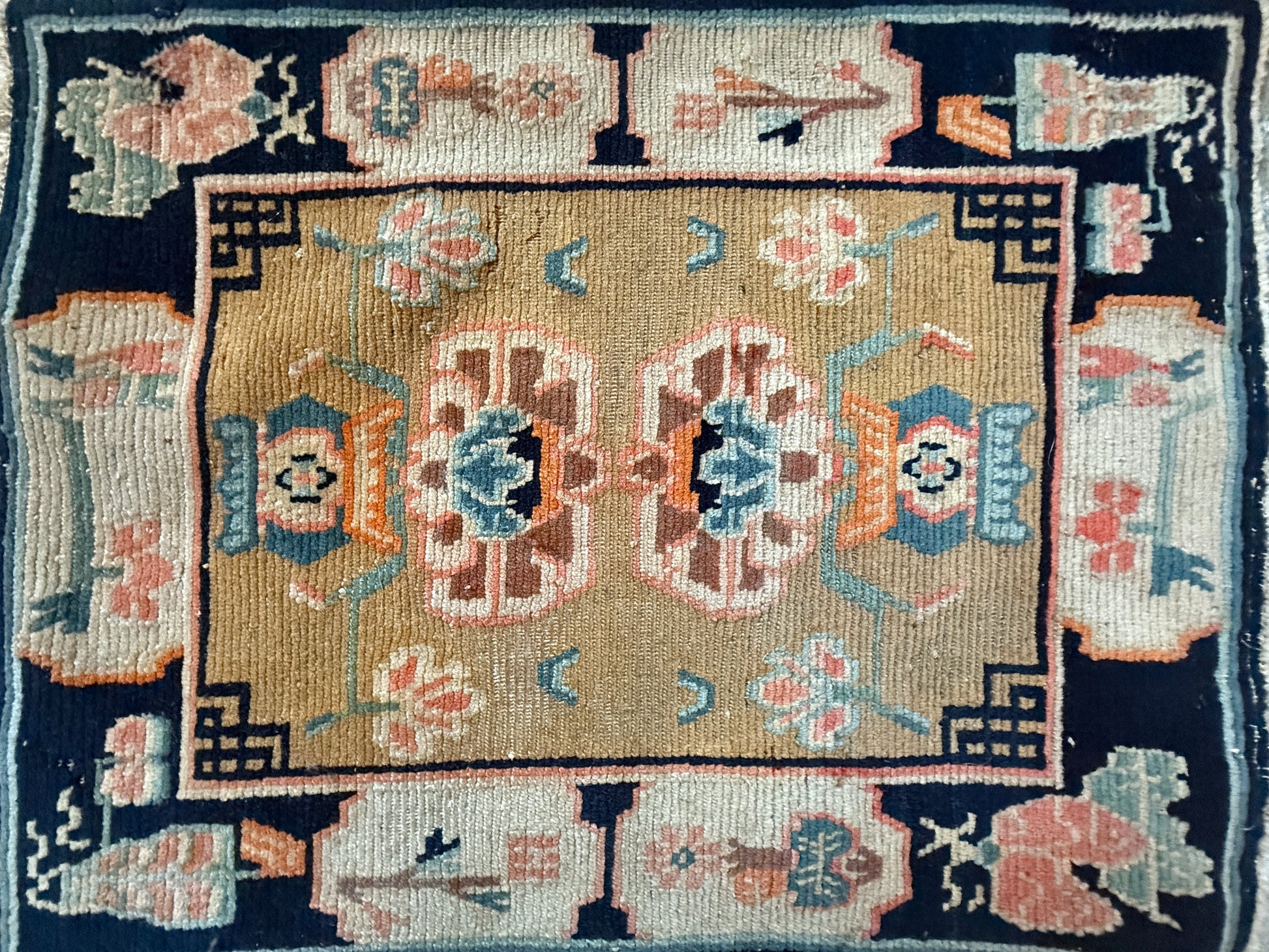 A antique Tibetan   seat rug - from the early  part of the  20th Century, made of wool -the rug with a beige background has two flower pots in the center and a border with floral motifs.