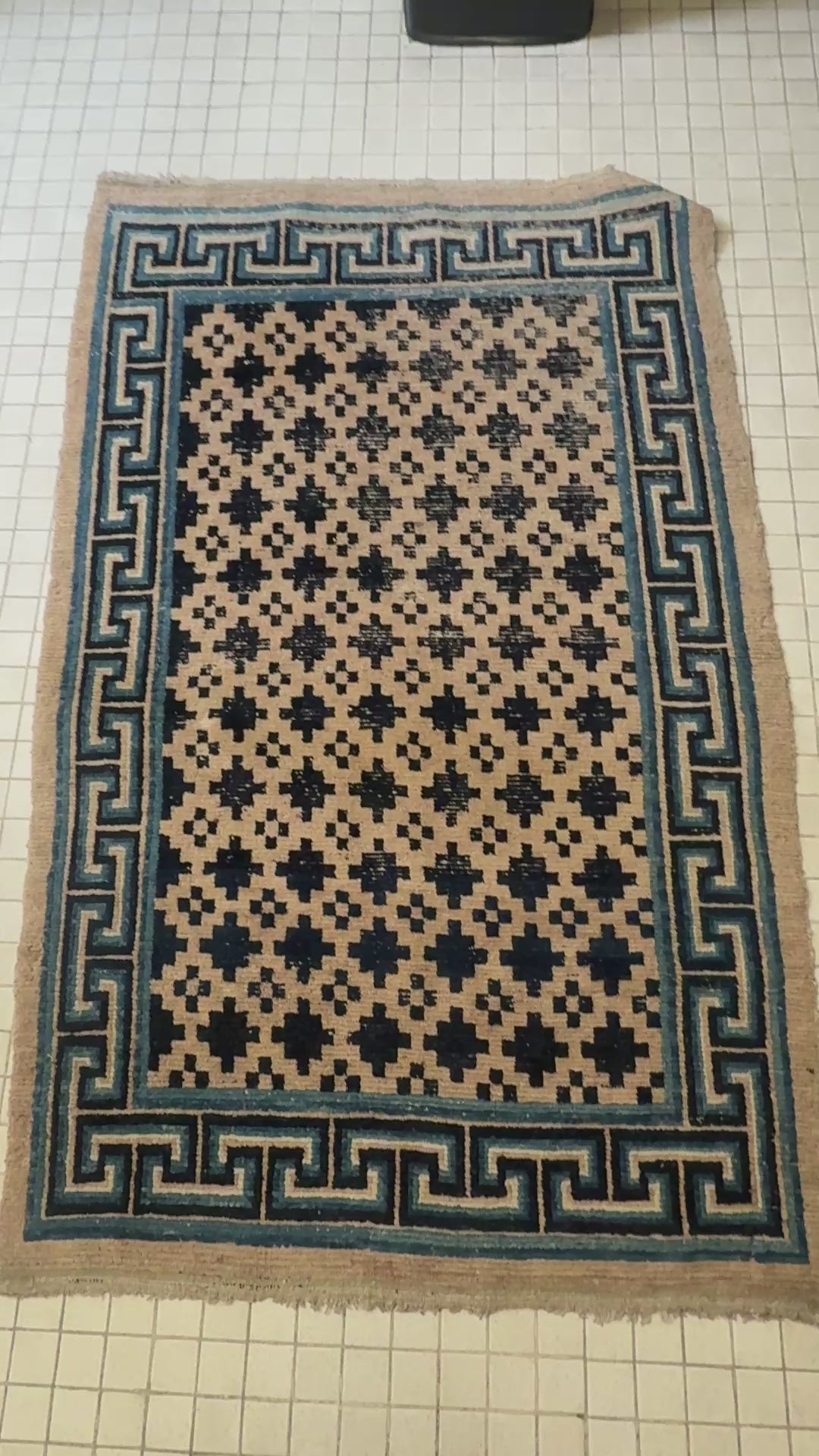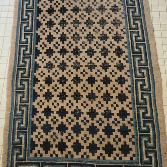 An antique mid 19th C., , Tibetan all wool rug [pile, weft and warp] with a simple repeating geometric checkerboard like pattern with a geometric border pattern. The rug is made with vegetable dyes only and a rich mix of blues and black on a beige background. The rug measures 5ft1in x 3ft .
