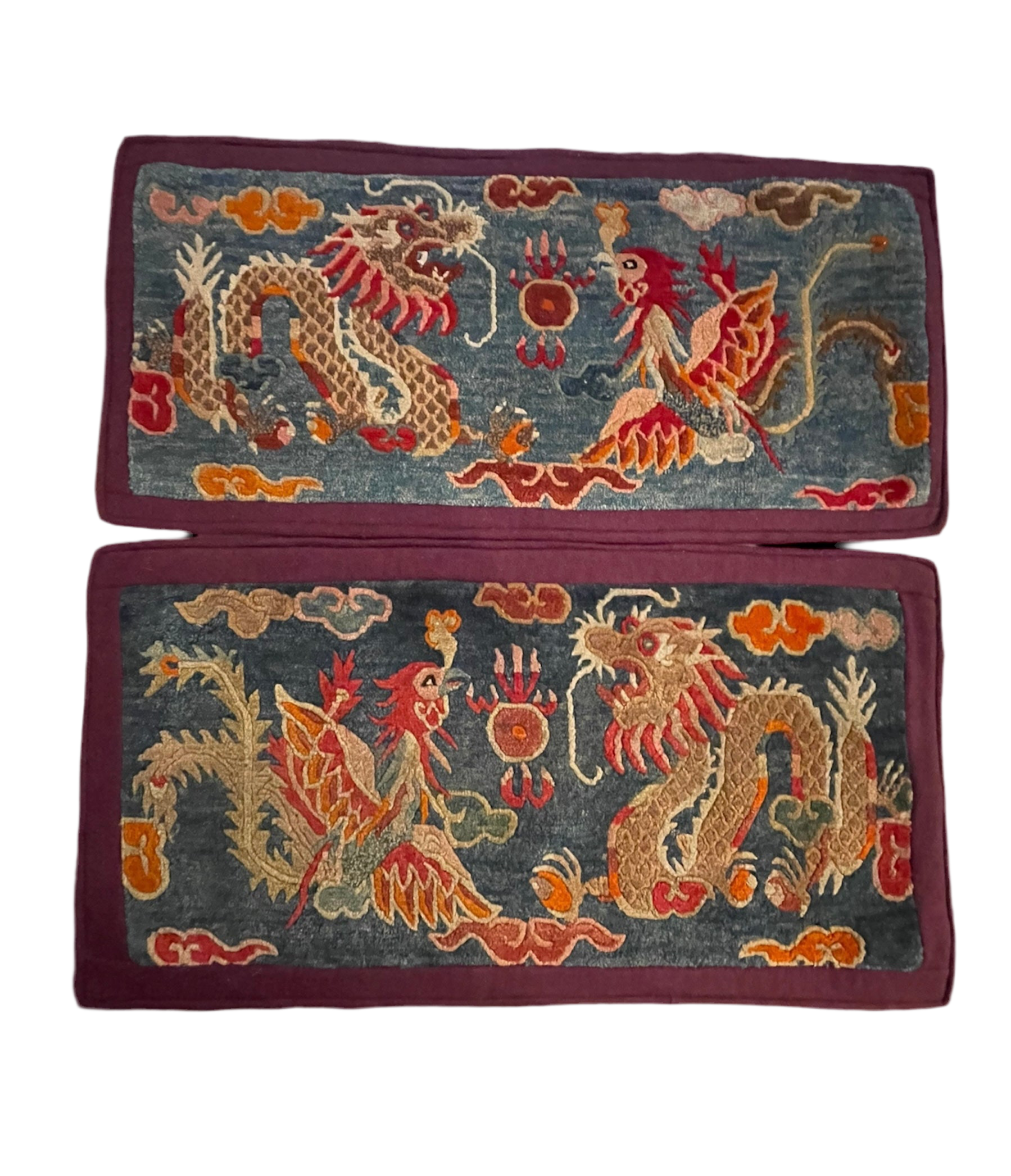 A pair of early 20th C., Tibetan backrest/pillow rugs measuring 17”x 31”. Each rug has a dragon and a phoenix with scattered clouds and with a bluish background. The rugs are in very good condition.