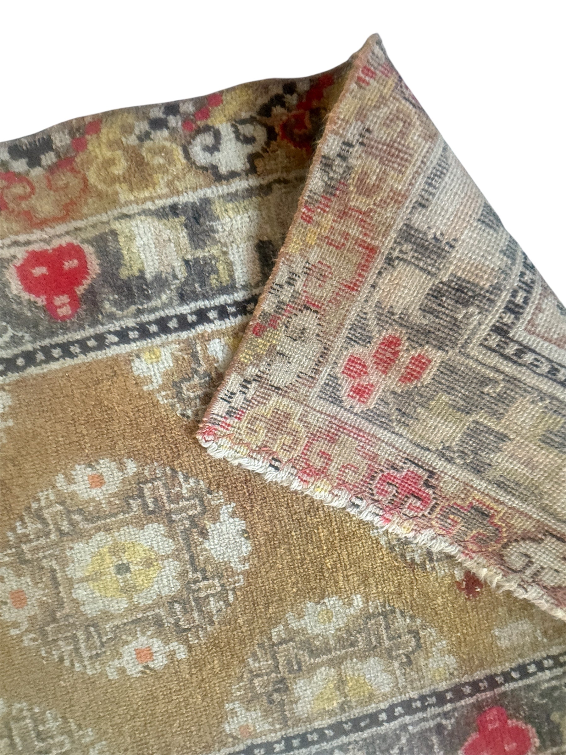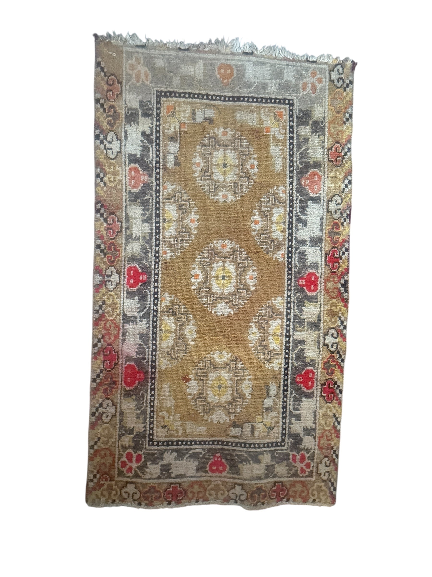 A vintage Chinese rug - from the lAttlee part of the 20th Century, made of wool -with three medallions in the center with a beige background and geometrical borders framing the medallions. The rug shows signs of wear - as most of the woolen pile is completely worn out. The rug measures 27”x49”